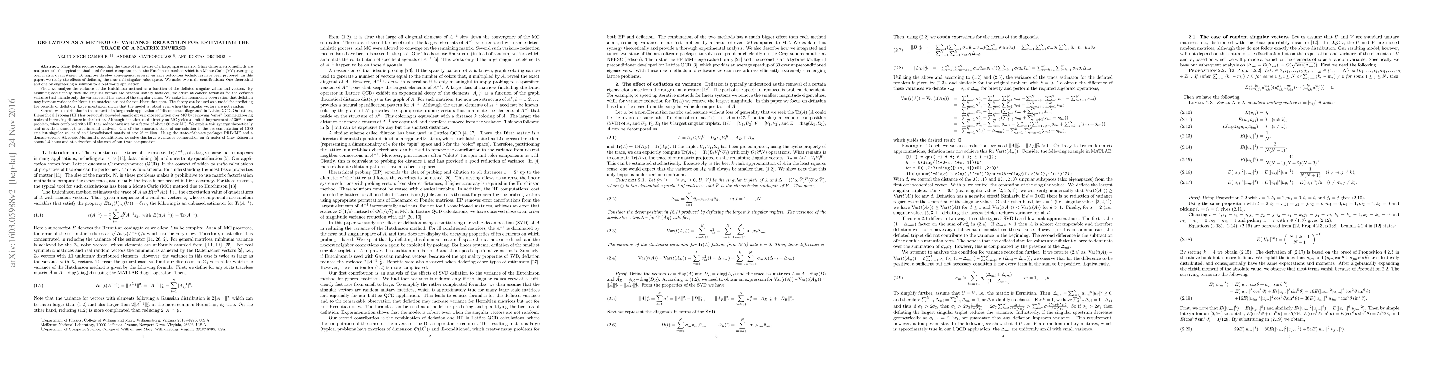 Many fields require computing the trace of the inverse of a large, sparse matrix. The typical method used for such computations is the Hutchinson method which is a Monte Carlo (MC) averaging over matrix quadratures. To improve its convergence, several variance reductions techniques have been proposed. In this paper, we study the effects of deflating the near null singular value space. We make two main contributions. First, we analyze the variance of the Hutchinson method as a function of the deflated singular values and vectors. Although this provides good intuition in general, by assuming additionally that the singular vectors are random unitary matrices, we arrive at concise formulas for the deflated variance that include only the variance and mean of the singular values. We make the remarkable observation that deflation may increase variance for Hermitian matrices but not for non-Hermitian ones. This is a rare, if not unique, property where non-Hermitian matrices outperform Hermitian ones. The theory can be used as a model for predicting the benefits of deflation. Second, we use deflation in the context of a large scale application of "disconnected diagrams" in Lattice QCD. On lattices, Hierarchical Probing (HP) has previously provided an order of magnitude of variance reduction over MC by removing "error" from neighboring nodes of increasing distance in the lattice. Although deflation used directly on MC yields a limited improvement of 30% in our problem, when combined with HP they reduce variance by a factor of over 60 compared to MC. For this, we pre-computated 1000 smallest singular values of an ill-conditioned matrix of size 25 million. Using PRIMME and a domain-specific Algebraic Multigrid preconditioner, we perform one of the largest eigenvalue computations in Lattice QCD at a fraction of the cost of our trace computation.