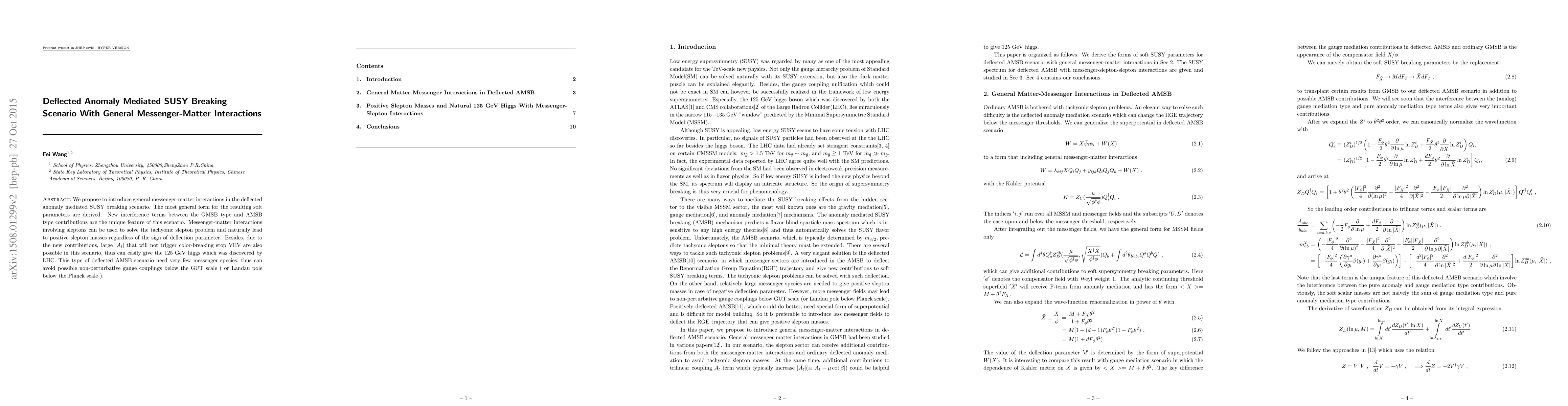 We propose to introduce general messenger-matter interactions in the deflected anomaly mediated SUSY breaking scenario. The most general form for the resulting soft parameters are derived. New interference terms between the GMSB type and AMSB type contributions are the unique feature of this scenario. Messenger-matter interactions involving sleptons can be used to solve the tachyonic slepton problem and naturally lead to positive slepton masses regardless of the sign of deflection parameter. Besides, due to the new contributions, large $|A_t|$ that will not trigger color-breaking stop VEV are also possible in this scenario, thus can easily give the 125 GeV higgs which was discovered by LHC. This type of deflected AMSB scenario need very few messenger species, thus can avoid possible non-perturbative gauge couplings below the GUT scale ( or Landau pole below the Planck scale ).