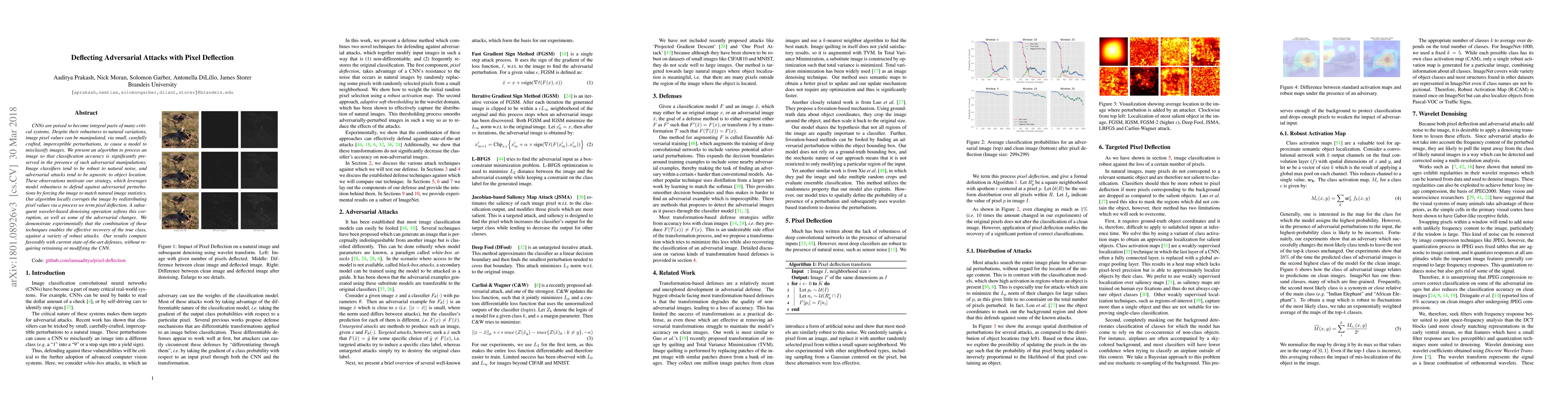 This paper proposes an algorithm termed pixel deflection to defend CNNs against adversarial attacks by redistributing pixel values to match natural image statistics, followed by wavelet-based denoising to recover true classifications, achieving better results than current defenses without requiring model retraining.