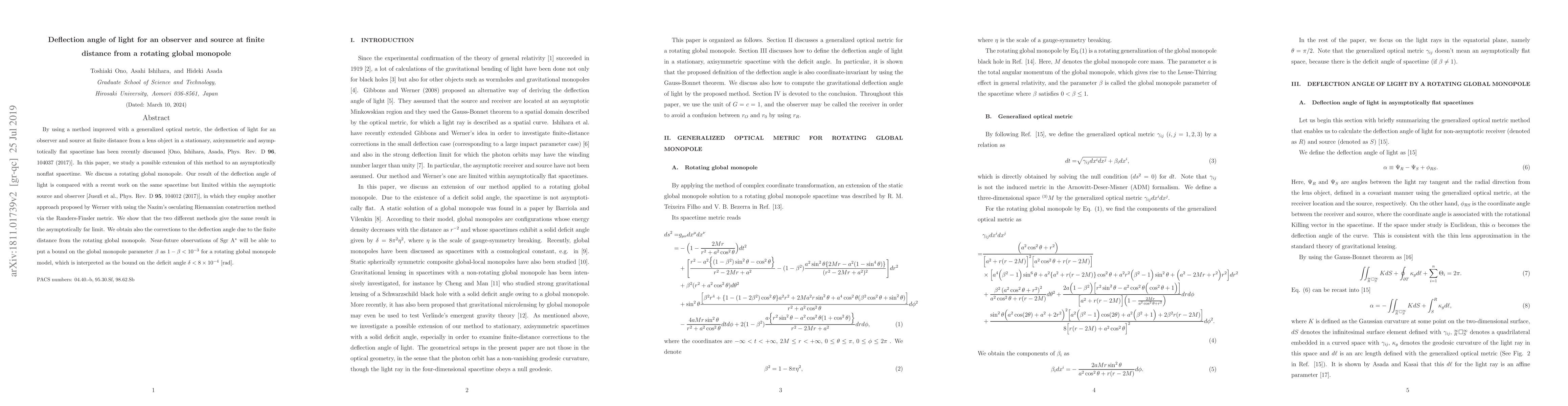 By using a method improved with a generalized optical metric, the deflection of light for an observer and source at finite distance from a lens object in a stationary, axisymmetric and asymptotically flat spacetime has been recently discussed [Ono, Ishihara, Asada, Phys. Rev. D {\bf 96}, 104037 (2017)]. In this paper, we study a possible extension of this method to an asymptotically nonflat spacetime. We discuss a rotating global monopole. Our result of the deflection angle of light is compared with a recent work on the same spacetime but limited within the asymptotic source and observer [Jusufi et al., Phys. Rev. D {\bf 95}, 104012 (2017)], in which they employ another approach proposed by Werner with using the Nazim's osculating Riemannian construction method via the Randers-Finsler metric. We show that the two different methods give the same result in the asymptotically far limit. We obtain also the corrections to the deflection angle due to the finite distance from the rotating global monopole. Near-future observations of Sgr A${}^{*}$ will be able to put a bound on the global monopole parameter $\beta$ as $1- \beta < 10^{-3}$ for a rotating global monopole model, which is interpreted as the bound on the deficit angle $\delta < 8\times 10^{-4}$ [rad].