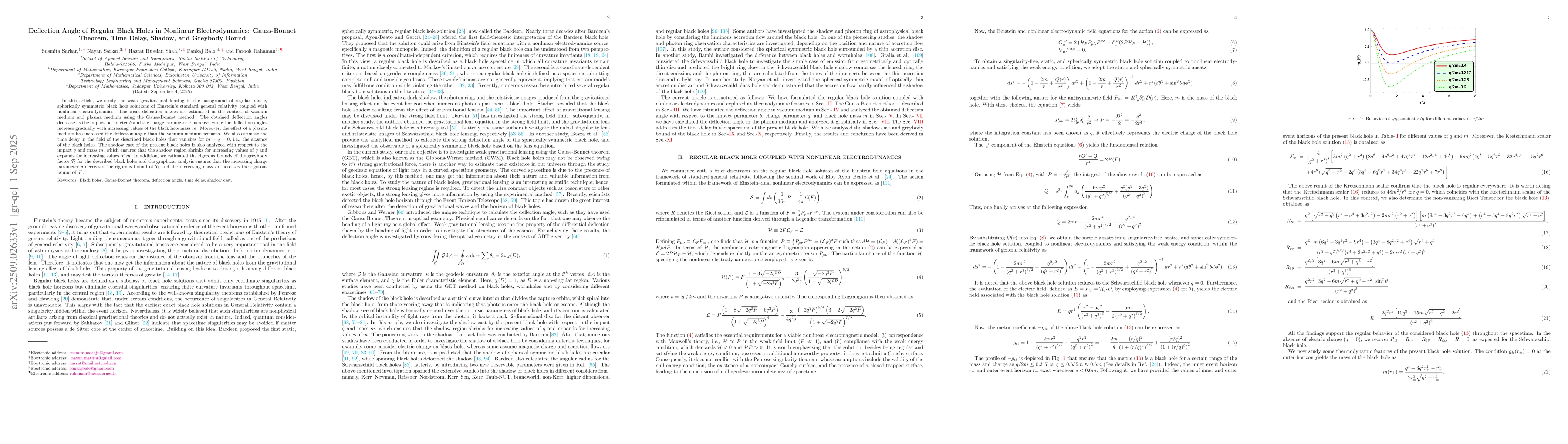 In this article, we study the weak gravitational lensing in the background of regular, static, spherically symmetric black hole solutions of Einstein's standard general relativity coupled with nonlinear electrodynamics. The weak deflection angles are estimated in the context of vacuum medium and plasma medium using the Gauss-Bonnet method. The obtained deflection angles decrease as the impact parameter $b$ and the charge parameter $q$ increase, while the deflection angles increase gradually with increasing values of the black hole mass $m$. Moreover, the effect of a plasma medium has increased the deflection angle than the vacuum medium scenario. We also estimate the time delay in the field of the described black holes that vanishes for $m = q =0$, i.e., the absence of the black holes. The shadow cast of the present black holes is also analyzed with respect to the impact $q$ and mass $m$, which ensures that the shadow region shrinks for increasing values of $q$ and expands for increasing values of $m$. In addition, we estimated the rigorous bounds of the greybody factor $\mathcal{T}_b$ for the described black holes and the graphical analysis ensures that the increasing charge parameter $q$ decreases the rigorous bound of $\mathcal{T}_b$ and the increasing mass $m$ increases the rigorous bound of $\mathcal{T}_b$.