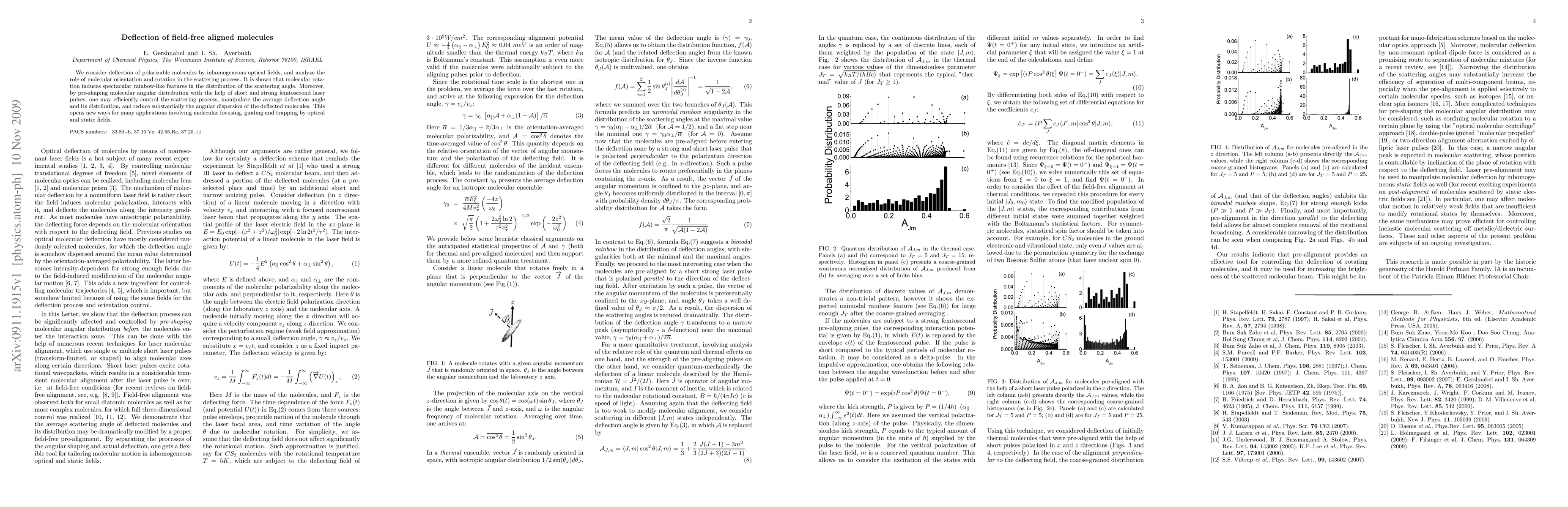 We consider deflection of polarizable molecules by inhomogeneous optical fields, and analyze the role of molecular orientation and rotation in the scattering process. It is shown that molecular rotation induces spectacular rainbow-like features in the distribution of the scattering angle. Moreover, by pre-shaping molecular angular distribution with the help of short and strong femtosecond laser pulses, one may efficiently control the scattering process, manipulate the average deflection angle and its distribution, and reduce substantially the angular dispersion of the deflected molecules. This opens new ways for many applications involving molecular focusing, guiding and trapping by optical and static fields.