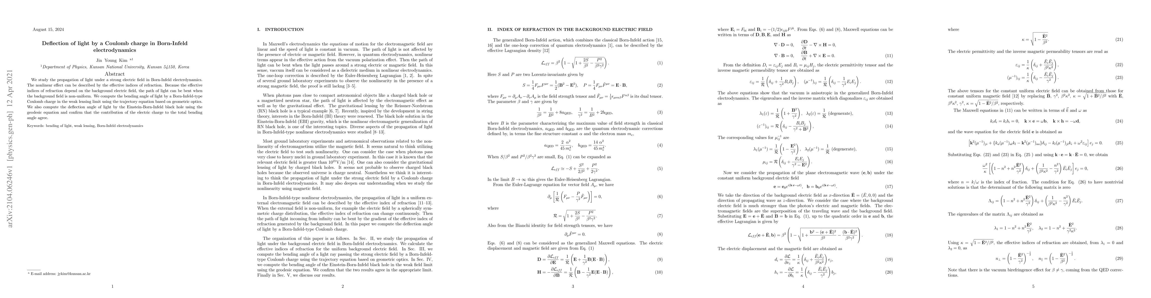 This paper investigates the deflection of light in Born-Infeld electrodynamics under strong electric fields, showing how nonlinear effects lead to bending of light paths. The study computes the deflection angle for both a Born-Infeld Coulomb charge and an Einstein-Born-Infeld black hole, confirming consistent contributions from electric charges to the bending angle.