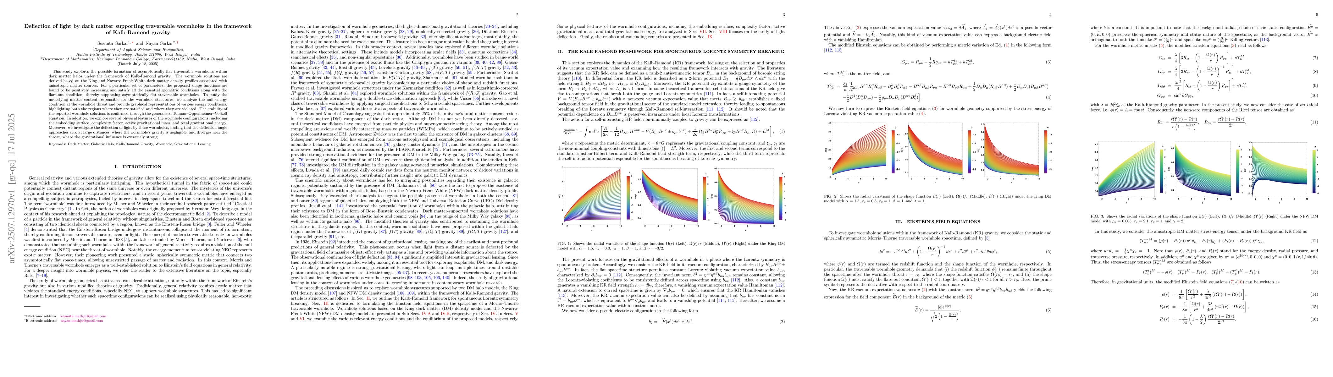 This study explores the possible formation of asymptotically flat traversable wormholes within dark matter halos under the framework of Kalb-Ramond gravity. The wormhole solutions are derived based on the King and Navarro-Frenk-White dark matter density profiles associated with anisotropic matter sources. For a particular set of parameters, the proposed shape functions are found to be positively increasing and satisfy all the essential geometric conditions along with the flare-out condition, thereby supporting asymptotically flat traversable wormholes. To study the underlying matter content responsible for the wormhole structures, we analyze the null energy condition at the wormhole throat and provide graphical representations of various energy conditions, highlighting both the regions where they are satisfied and where they are violated. The stability of the reported wormhole solutions is confirmed through the generalized Tolman-Oppenheimer-Volkoff equation. In addition, we explore several physical features of the wormhole configurations, including the embedding surface, complexity factor, active gravitational mass, and total gravitational energy. Moreover, we investigate the deflection of light by these wormholes, finding that the deflection angle approaches zero at large distances, where the wormhole's gravity is negligible, and diverges near the throat, where the gravitational influence is extremely strong.