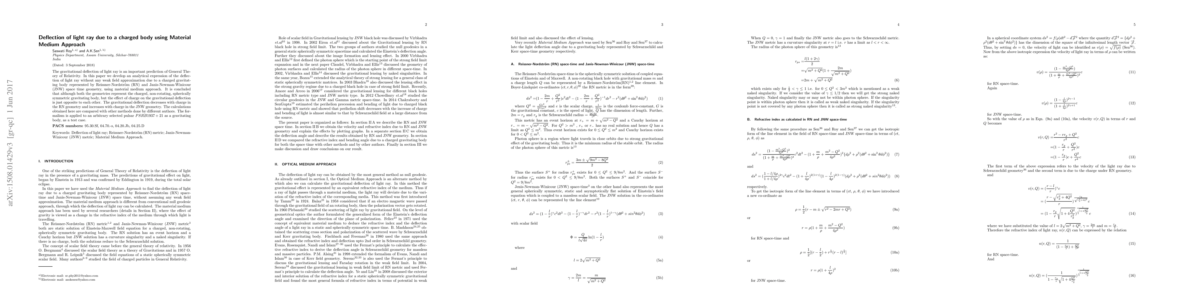 This paper develops an analytical expression for the deflection of light rays around a charged, non-rotating, spherically symmetric gravitating body using material medium and Reissner-Nordström and Janis-Newman-Winicour spacetime geometries. It finds that charge has opposite effects on deflection in these geometries, with decreasing deflection in the former and increasing in the latter.
