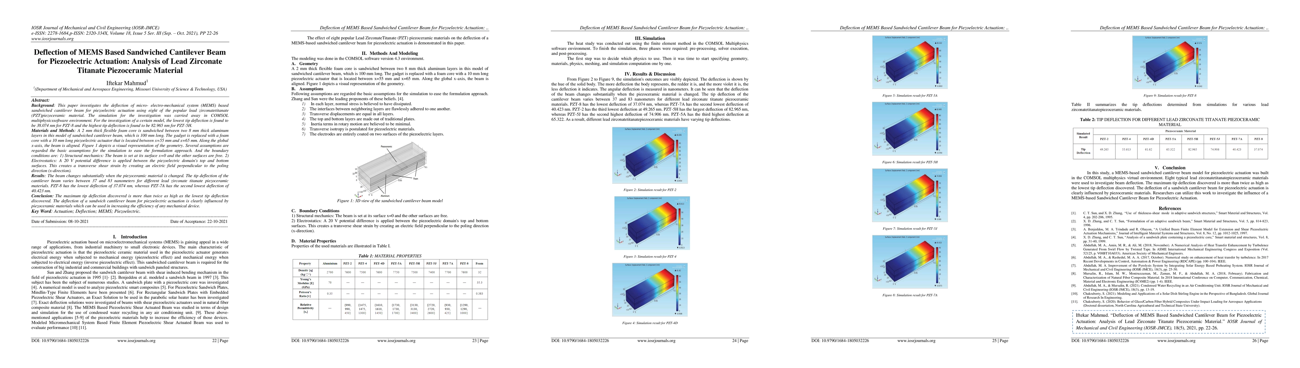 This paper analyzes the deflection of MEMS-based sandwiched cantilever beams using various lead zirconate titanate (PZT) piezoceramic materials, finding tip deflections ranging from 37 to 83 nanometers. The study shows that PZT-8 yields the lowest deflection, while PZT-5H results in the highest, indicating the significant impact of piezoceramic material on beam performance.