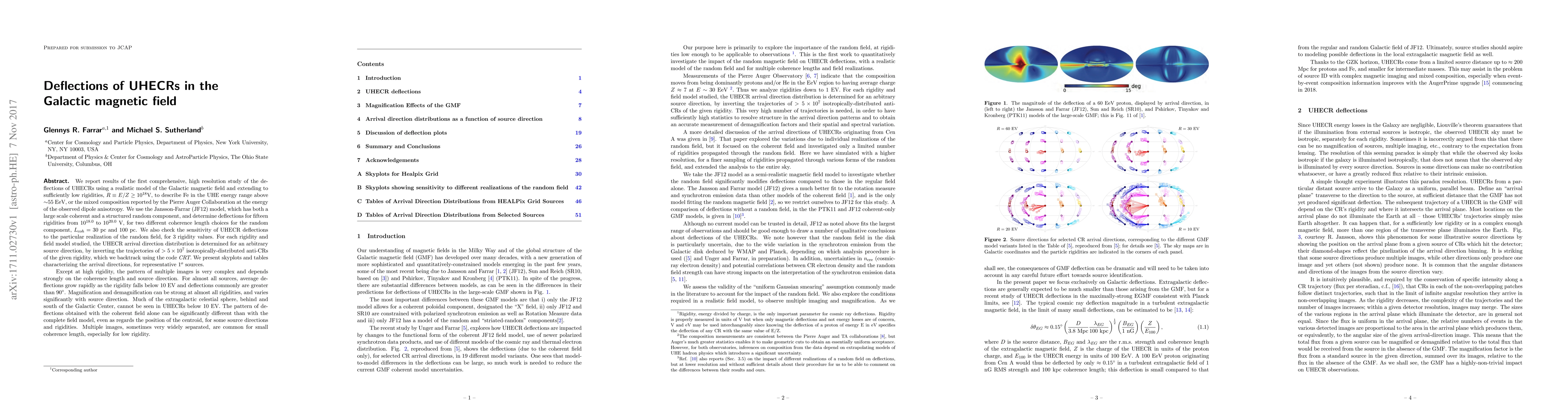 We report results of the first comprehensive, high resolution study of the deflections of UHECRs using a realistic model of the Galactic magnetic field and extending to sufficiently low rigidities, R = E/Z = 10^18 V, to describe Fe in the UHE energy range or the mixed composition reported by the Pierre Auger Collaboration at the energy of the observed dipole anisotropy. We use the Jansson-Farrar (JF12) model, which has both large scale coherent and a structured random components, and determine deflections for fifteen rigidities from 10^18.0 to 10^20.0 V, for L_coh = 30 pc and 100 pc. We check the sensitivity of UHECR deflections to the particular realization of the random field, for 3 rigidity values. For each rigidity and field model studied, the UHECR arrival direction distribution is determined for an arbitrary source direction, by inverting the trajectories of > 5 x 10^7 isotropic anti-CRs of the given rigidity. We present skyplots and tables characterizing the arrival directions, for representative 1 deg sources. Except at high rigidity, the pattern of multiple images is very complex and depends strongly on the coherence length and source direction. For almost all sources, average deflections grow rapidly as the rigidity falls below 10 EV and deflections commonly are greater than 90 deg. Magnification and demagnification can be strong at almost all rigidities, and varies significantly with source direction. Much of the extragalactic celestial sphere, behind and south of the Galactic Center, cannot be seen in UHECRs below 10 EV. The pattern of deflections obtained with the coherent field alone can be significantly different than with the complete field model, even as regards the position of the centroid, for some source directions and rigidities. Multiple images, sometimes very widely separated, are common for small coherence length, especially for low rigidity.