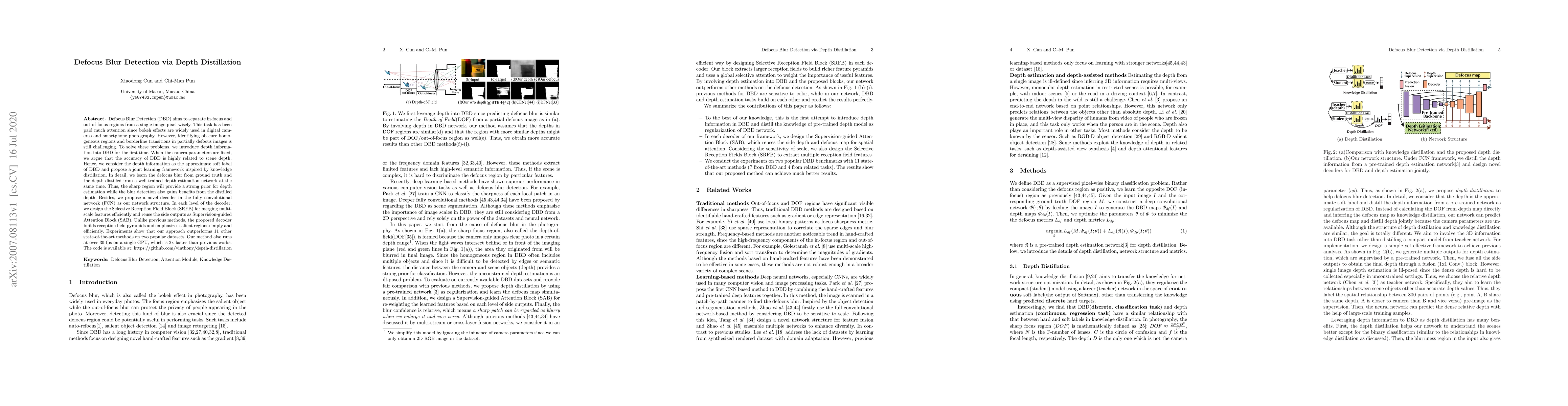 This paper proposes a novel method for Defocus Blur Detection (DBD) by integrating depth information through knowledge distillation, enhancing the accuracy of distinguishing in-focus and out-of-focus regions. The method employs a joint learning framework and a decoder with Selective Reception Field Blocks and Supervision-guided Attention Blocks, achieving superior performance and speed compared to other state-of-the-art techniques.