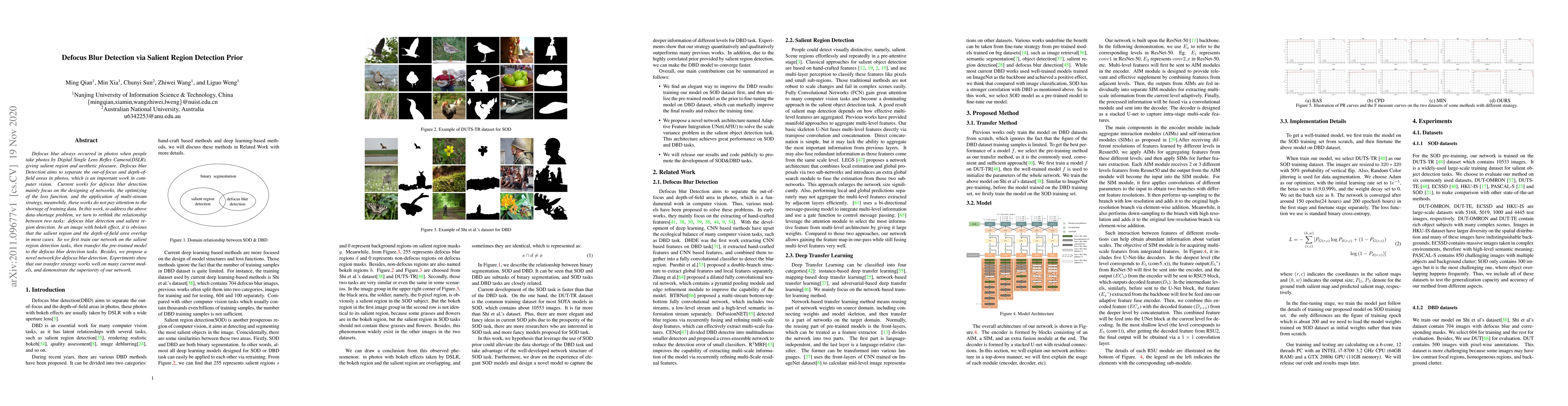 This paper proposes a novel method for defocus blur detection by leveraging salient region detection to address the issue of data scarcity in training. The authors train a network on salient region detection first, then transfer the pre-trained model to defocus blur detection, demonstrating improved performance over existing methods.