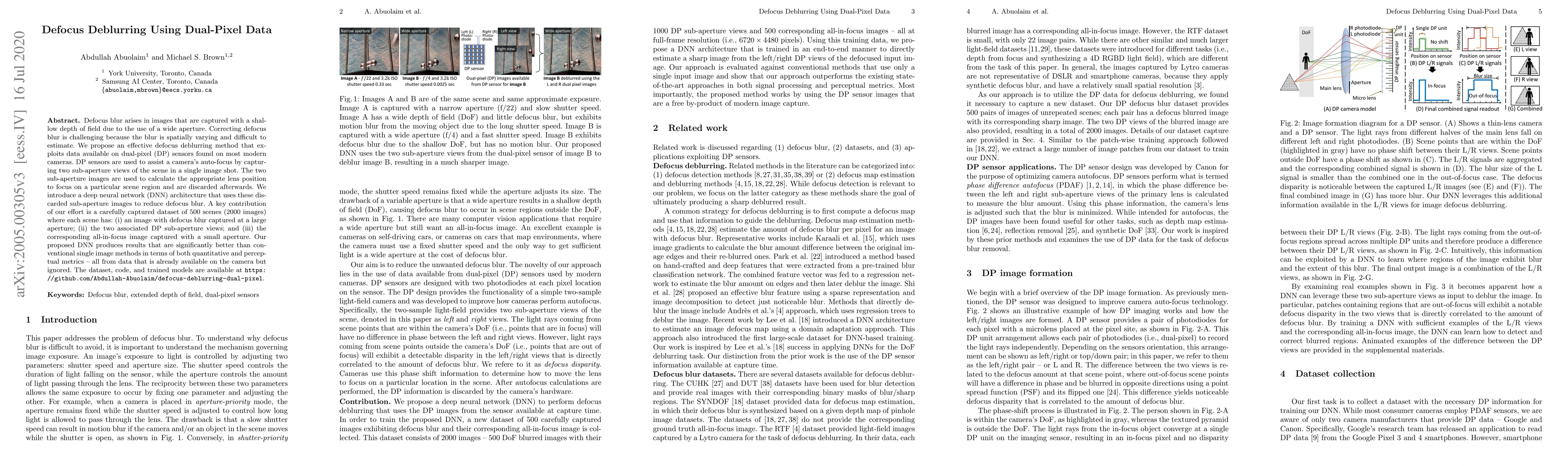 This paper proposes a defocus deblurring method using dual-pixel sensor data from modern cameras, which captures two sub-aperture views to assist auto-focus. A deep neural network leverages these views to reduce defocus blur, outperforming conventional methods. The method is validated using a new dataset with 500 scenes, providing both blurred and focused images.