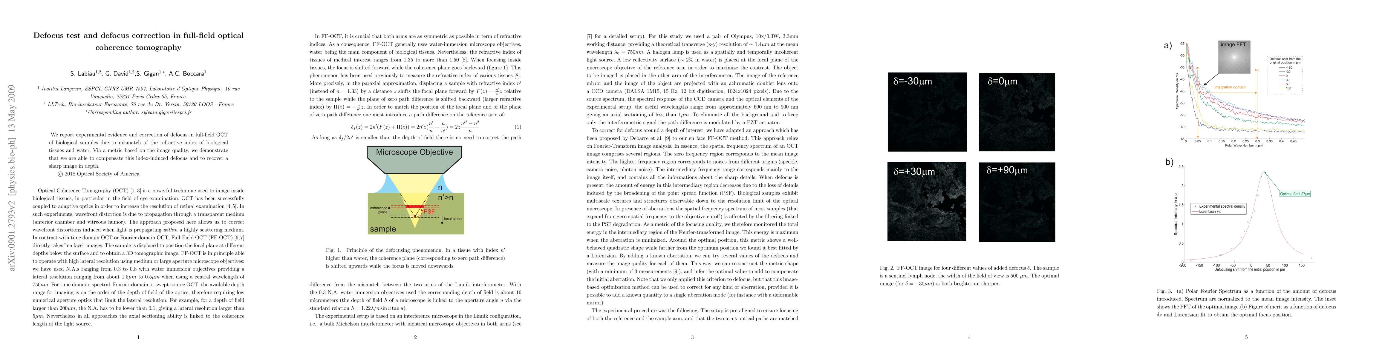 This paper presents an experimental method to correct defocus in full-field optical coherence tomography (OCT) caused by refractive index mismatch between biological tissues and water. The authors demonstrate a metric-based approach to compensate for this defocus, thereby recovering sharp images in depth.