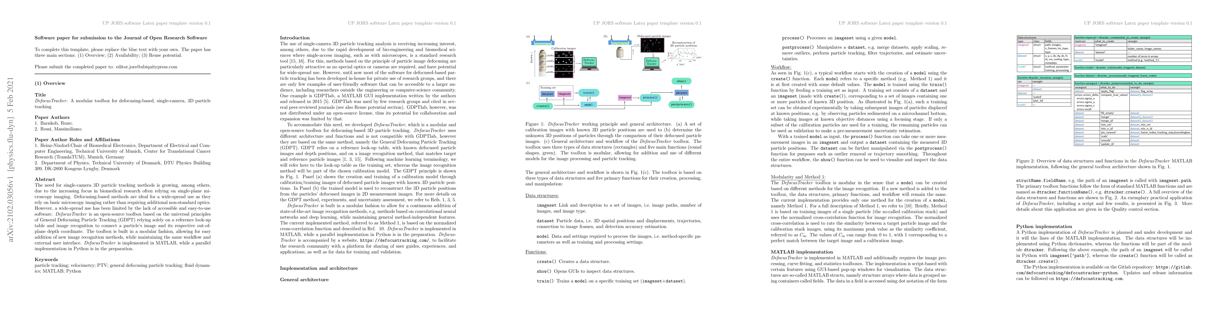 DefocusTracker is an open-source toolbox for single-camera 3D particle tracking using defocusing-based methods, which are now more accessible due to its modular design and user-friendly interface. The toolbox, built in MATLAB with a Python version in development, utilizes General Defocusing Particle Tracking (GDPT) principles and image recognition, facilitating easy addition of new recognition methods while preserving workflow consistency.