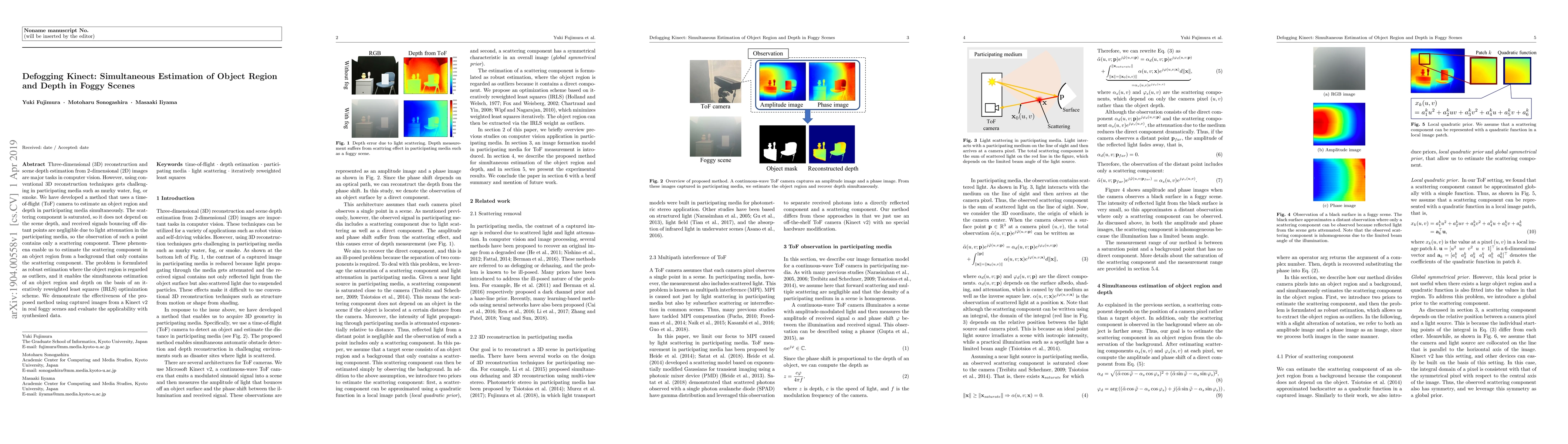 Three-dimensional (3D) reconstruction and scene depth estimation from 2-dimensional (2D) images are major tasks in computer vision. However, using conventional 3D reconstruction techniques gets challenging in participating media such as murky water, fog, or smoke. We have developed a method that uses a time-of-flight (ToF) camera to estimate an object region and depth in participating media simultaneously. The scattering component is saturated, so it does not depend on the scene depth, and received signals bouncing off distant points are negligible due to light attenuation in the participating media, so the observation of such a point contains only a scattering component. These phenomena enable us to estimate the scattering component in an object region from a background that only contains the scattering component. The problem is formulated as robust estimation where the object region is regarded as outliers, and it enables the simultaneous estimation of an object region and depth on the basis of an iteratively reweighted least squares (IRLS) optimization scheme. We demonstrate the effectiveness of the proposed method using captured images from a Kinect v2 in real foggy scenes and evaluate the applicability with synthesized data.