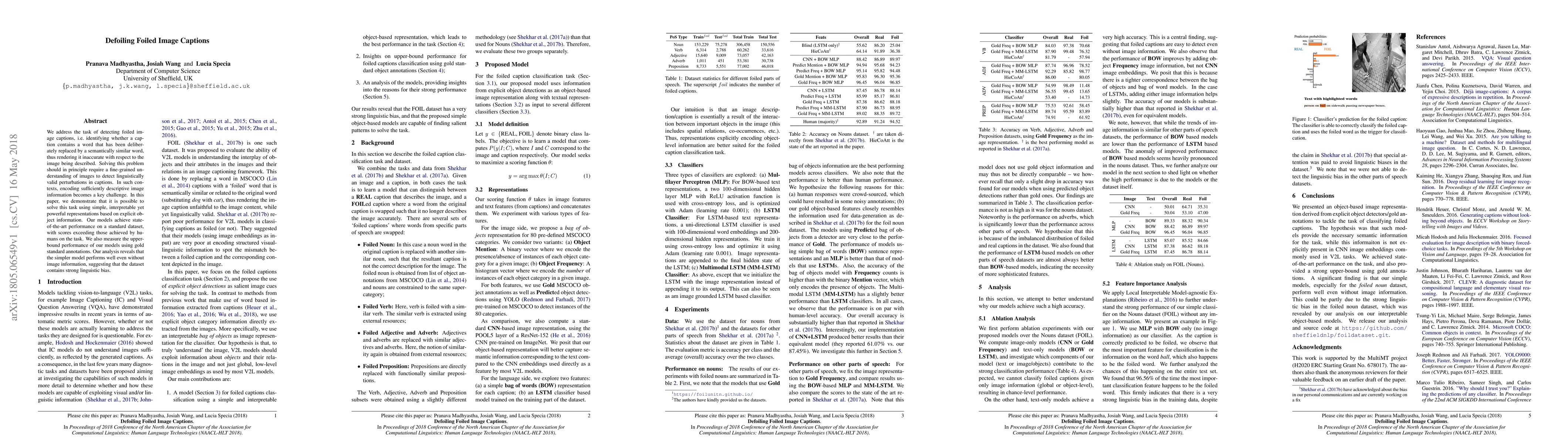 We address the task of detecting foiled image captions, i.e. identifying whether a caption contains a word that has been deliberately replaced by a semantically similar word, thus rendering it inaccurate with respect to the image being described. Solving this problem should in principle require a fine-grained understanding of images to detect linguistically valid perturbations in captions. In such contexts, encoding sufficiently descriptive image information becomes a key challenge. In this paper, we demonstrate that it is possible to solve this task using simple, interpretable yet powerful representations based on explicit object information. Our models achieve state-of-the-art performance on a standard dataset, with scores exceeding those achieved by humans on the task. We also measure the upper-bound performance of our models using gold standard annotations. Our analysis reveals that the simpler model performs well even without image information, suggesting that the dataset contains strong linguistic bias.