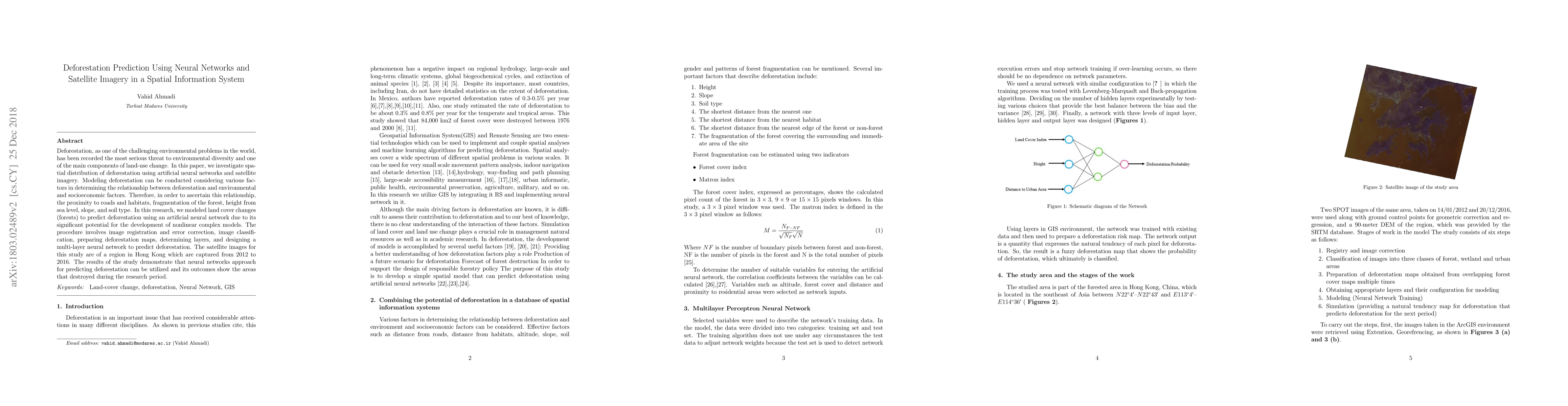 This paper explores the spatial distribution of deforestation in Hong Kong using artificial neural networks and satellite imagery from 2012 to 2016. The study models land cover changes to predict deforestation, incorporating factors like proximity to roads and forest fragmentation, and demonstrates the effectiveness of neural networks in identifying deforested areas.