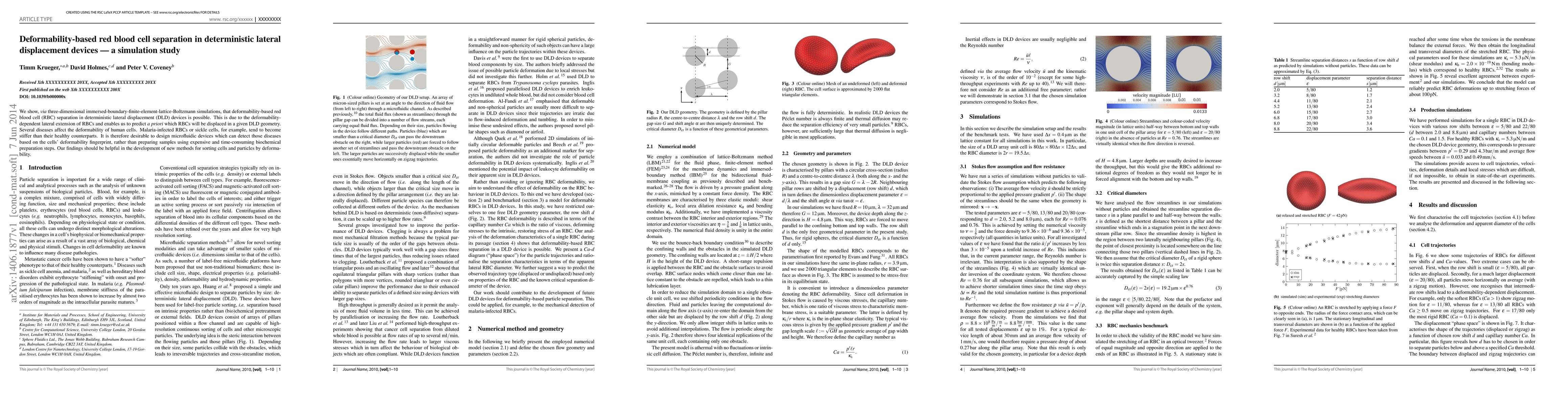 This study demonstrates via simulations that red blood cells can be separated based on deformability in deterministic lateral displacement devices, offering a predictive model for cell displacement. The approach aims to detect diseases like malaria and sickle cell anemia through cell deformability without the need for biochemical preparation, aiding in the development of deformability-based cell sorting techniques.
