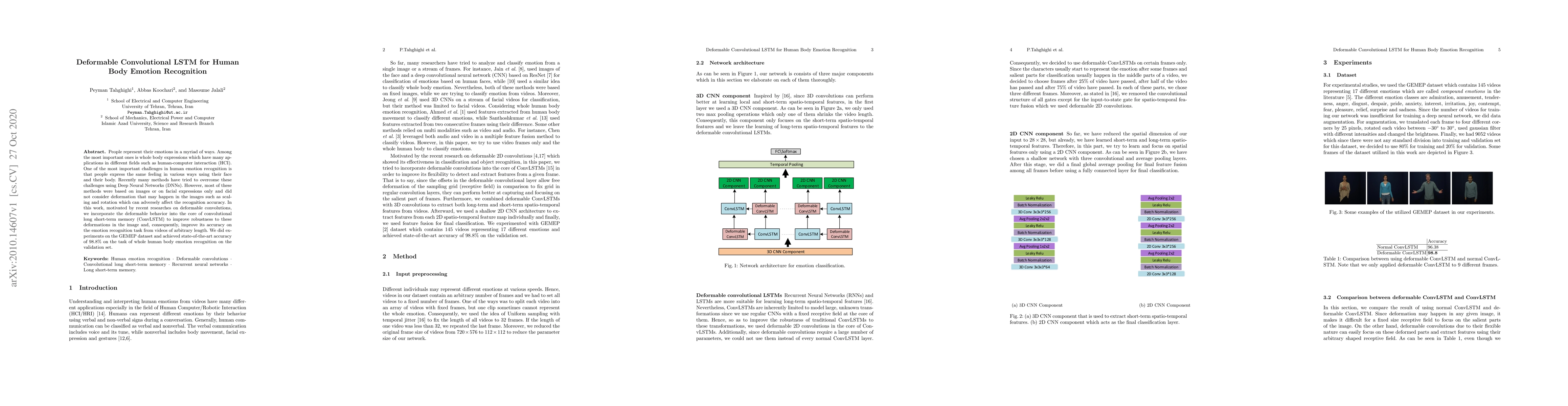 This paper proposes a Deformable Convolutional LSTM (ConvLSTM) to enhance human body emotion recognition from videos, addressing deformations like scaling and rotation. Experiments on the GEMEP dataset achieved a state-of-the-art accuracy of 98.8% in recognizing whole body emotions.