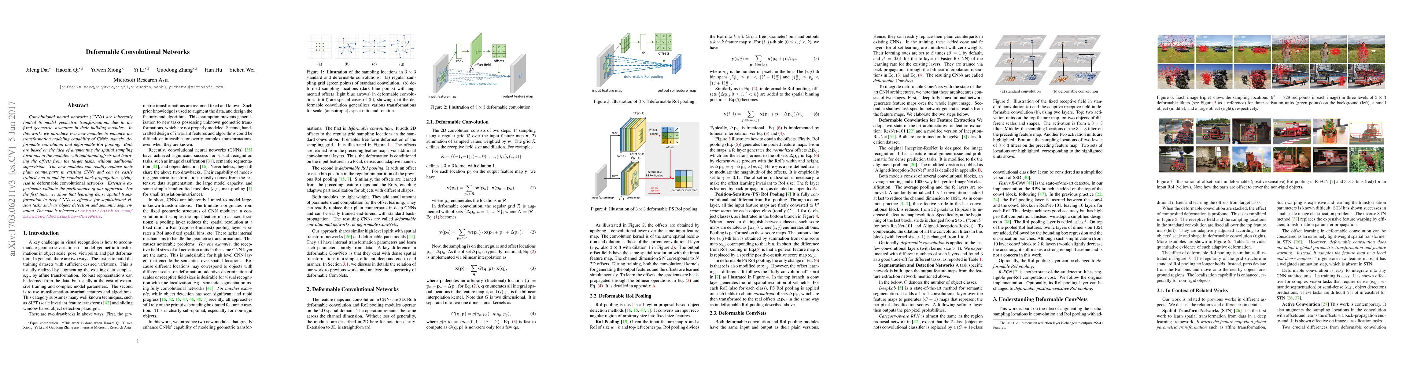 This paper introduces deformable convolutional networks to enhance CNNs' ability to model geometric transformations by adding deformable convolution and deformable RoI pooling modules, which learn spatial sampling offsets during training. These modules improve performance on object detection and semantic segmentation tasks.