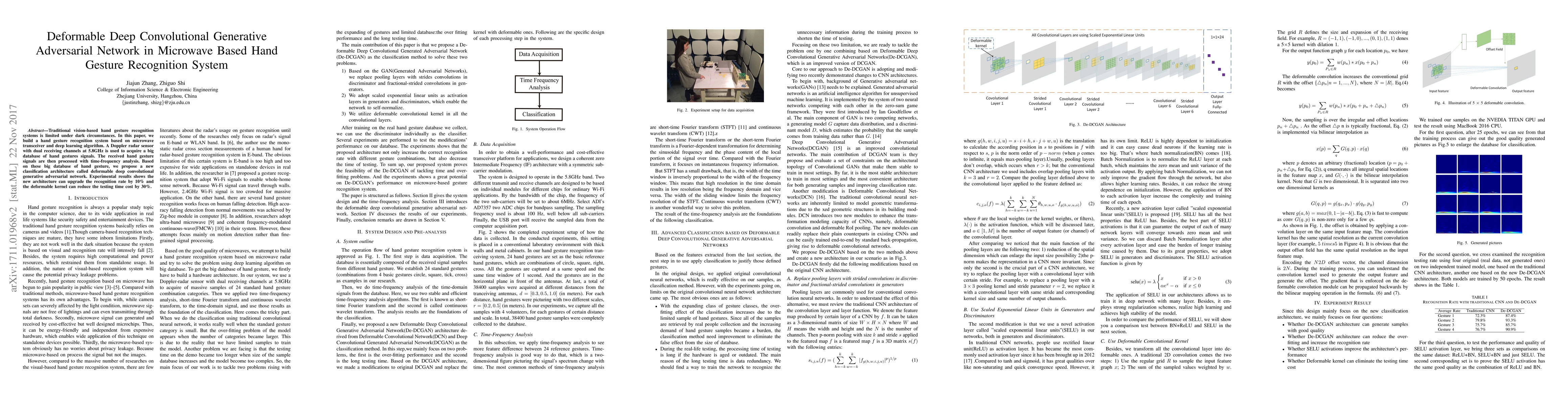 Traditional vision-based hand gesture recognition systems is limited under dark circumstances. In this paper, we build a hand gesture recognition system based on microwave transceiver and deep learning algorithm. A Doppler radar sensor with dual receiving channels at 5.8GHz is used to acquire a big database of hand gestures signals. The received hand gesture signals are then processed with time-frequency analysis. Based on these big databases of hand gesture, we propose a new machine learning architecture called deformable deep convolutional generative adversarial network. Experimental results show the new architecture can upgrade the recognition rate by 10% and the deformable kernel can reduce the testing time cost by 30%.