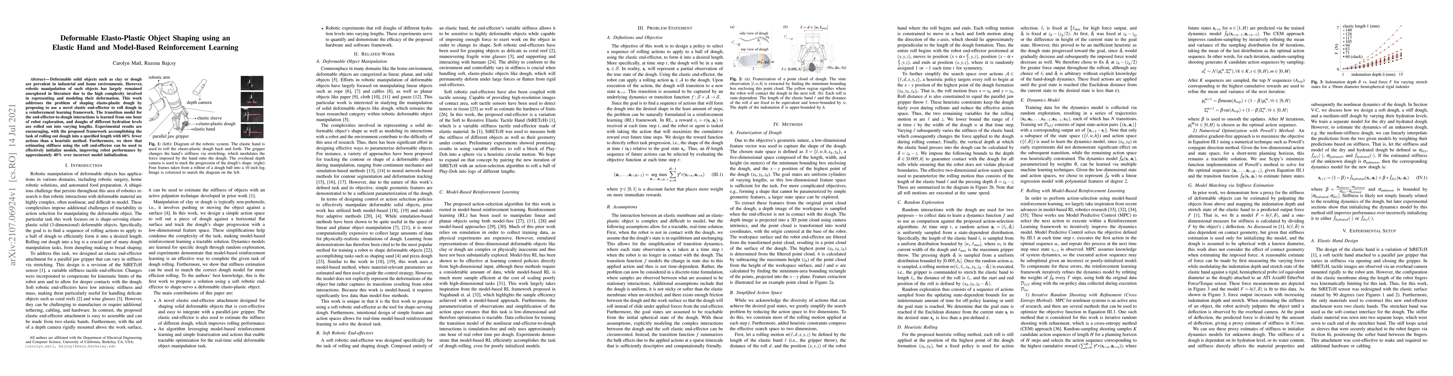 This paper proposes a novel elastic end-effector and model-based reinforcement learning approach to shape deformable elasto-plastic objects like dough. The method learns from an hour of exploration, achieving 60% fewer actions than a heuristic method and improving performance by 40% through better model initialization.