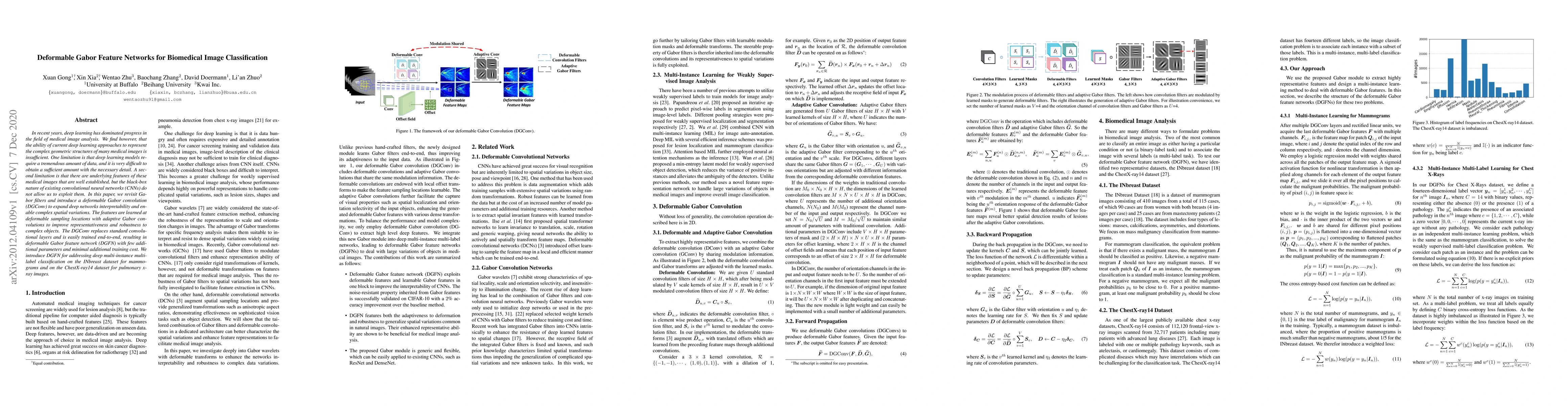 In recent years, deep learning has dominated progress in the field of medical image analysis. We find however, that the ability of current deep learning approaches to represent the complex geometric structures of many medical images is insufficient. One limitation is that deep learning models require a tremendous amount of data, and it is very difficult to obtain a sufficient amount with the necessary detail. A second limitation is that there are underlying features of these medical images that are well established, but the black-box nature of existing convolutional neural networks (CNNs) do not allow us to exploit them. In this paper, we revisit Gabor filters and introduce a deformable Gabor convolution (DGConv) to expand deep networks interpretability and enable complex spatial variations. The features are learned at deformable sampling locations with adaptive Gabor convolutions to improve representativeness and robustness to complex objects. The DGConv replaces standard convolutional layers and is easily trained end-to-end, resulting in deformable Gabor feature network (DGFN) with few additional parameters and minimal additional training cost. We introduce DGFN for addressing deep multi-instance multi-label classification on the INbreast dataset for mammograms and on the ChestX-ray14 dataset for pulmonary x-ray images.
