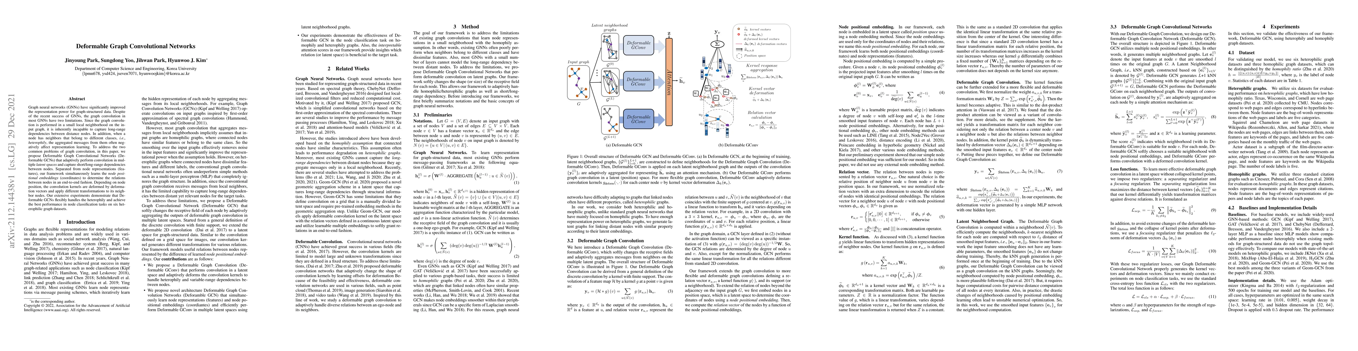 This paper proposes Deformable Graph Convolutional Networks (Deformable GCNs) to address limitations in graph convolution, specifically the inability to capture long-range dependencies and the negative impact of heterophily. Deformable GCNs adaptively perform convolution in multiple latent spaces and learn node positional embeddings to determine node relations, achieving superior performance in node classification on heterophilic graphs.