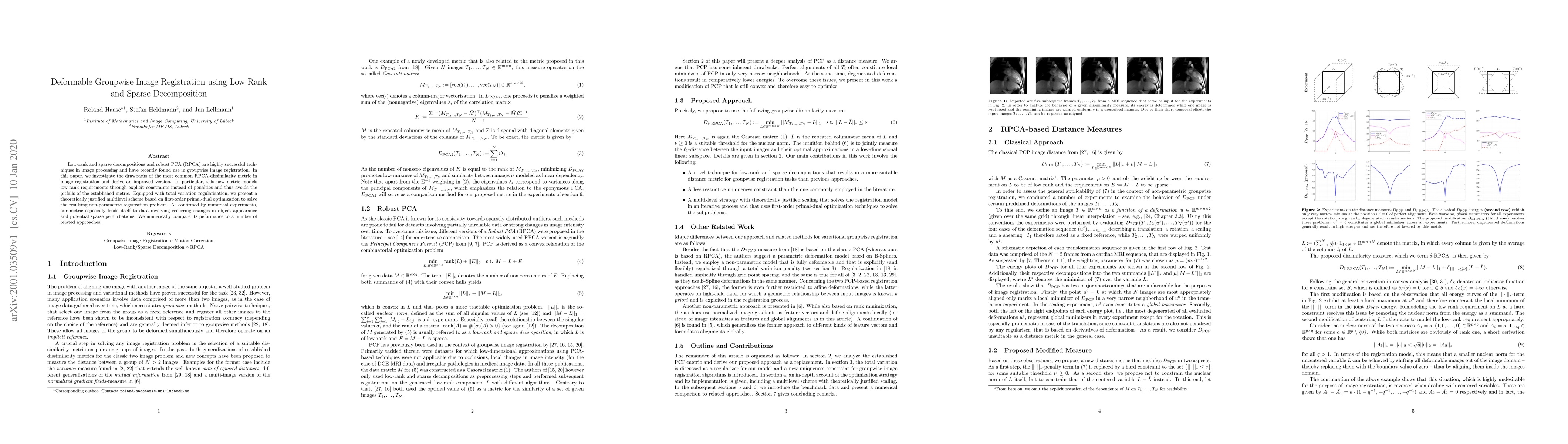 This paper proposes an improved metric for deformable groupwise image registration, addressing the limitations of existing RPCA-based dissimilarity metrics. It introduces explicit constraints for low-rank requirements and employs total variation regularization with a multilevel primal-dual optimization scheme, demonstrating superior performance in handling recurring changes and sparse perturbations.