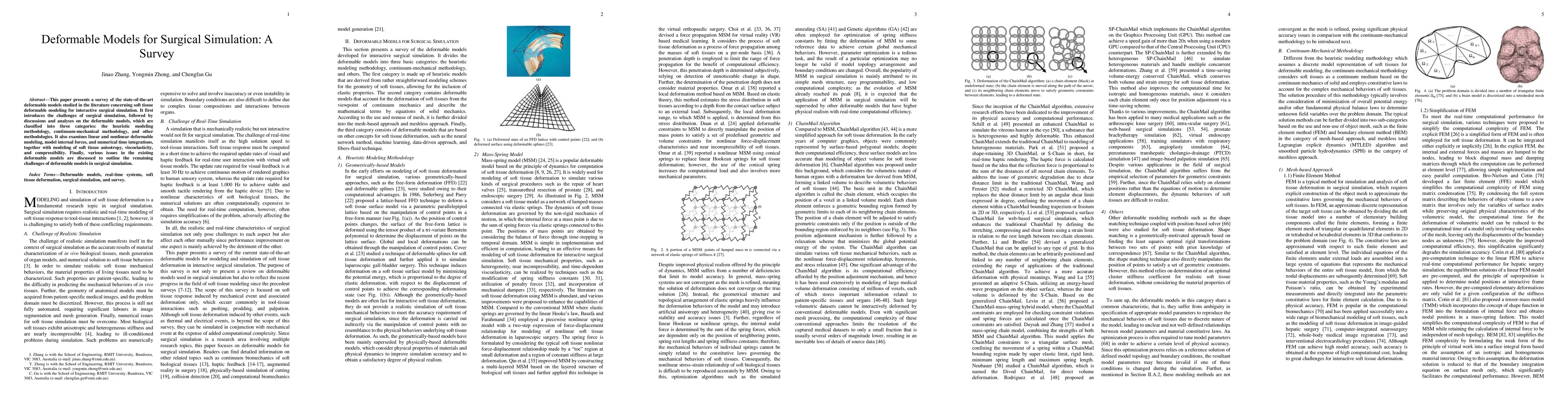 This paper surveys advanced deformable models for surgical simulation, categorizing them into heuristic, continuum-mechanical, and other methodologies, and discusses challenges like anisotropy, viscoelasticity, and compressibility. It highlights remaining issues and future directions for deformable models in surgical applications.
