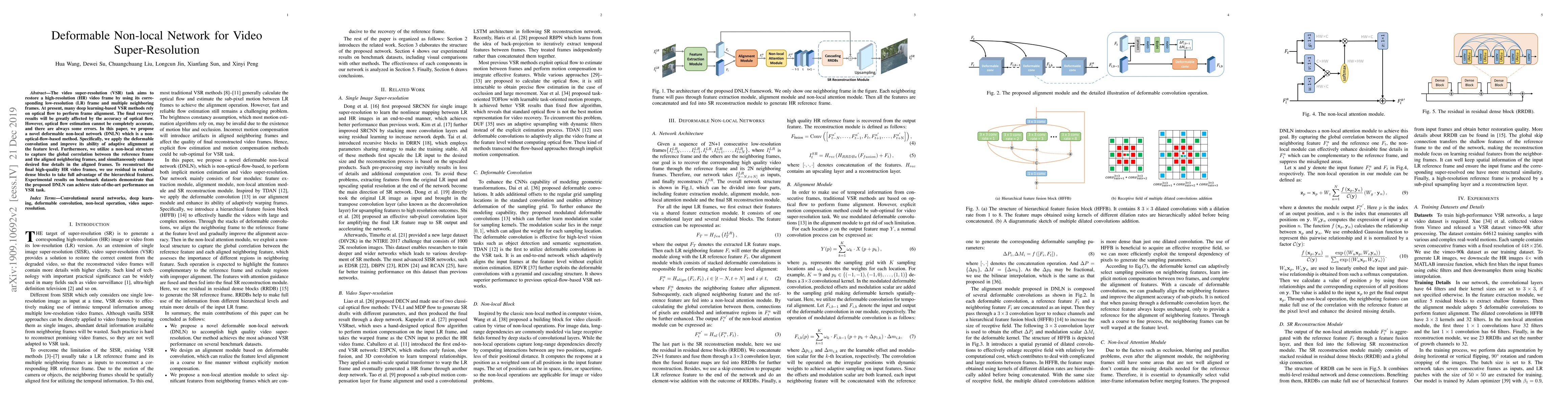 The paper proposes a deformable non-local network (DNLN) for video super-resolution that eliminates reliance on optical flow, using deformable convolution and non-local blocks to adaptively align features and enhance details, achieving state-of-the-art results on benchmark datasets.