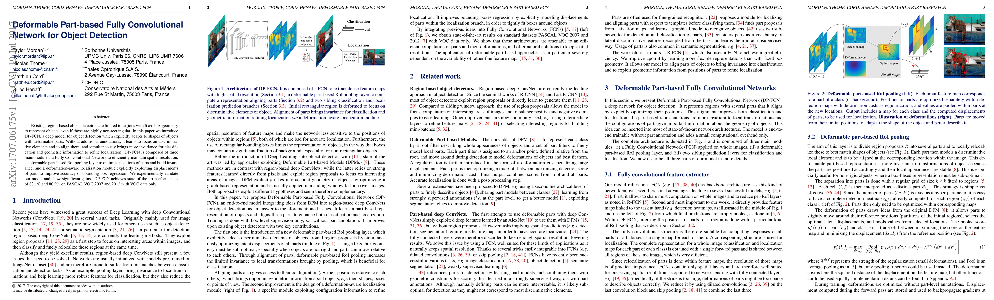 This paper introduces DP-FCN, a deep object detection model that adapts to non-rectangular shapes using deformable parts, achieving state-of-the-art performance in Pascal VOC 2007 and 2012 with minimal additional annotations.