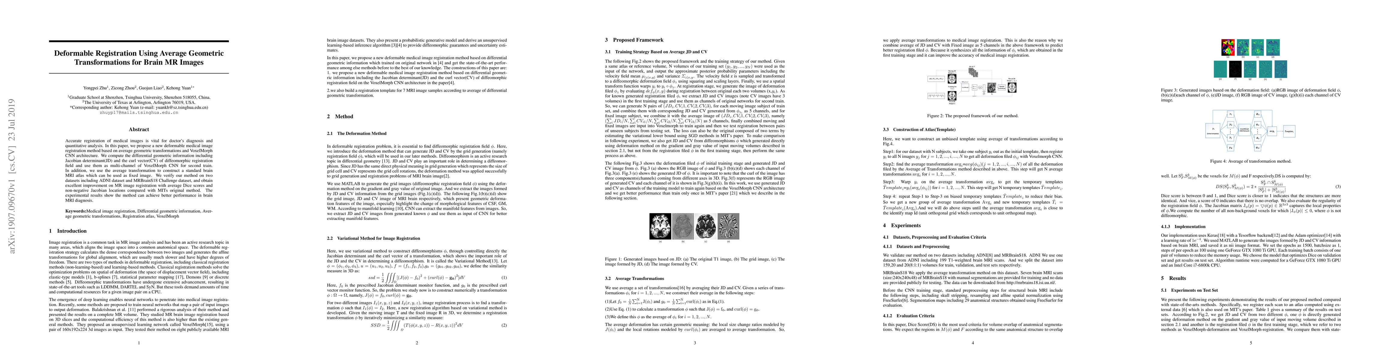 The paper proposes a deformable medical image registration method using average geometric transformations and VoxelMorph CNN architecture. It computes Jacobian determinant (JD) and curl vector (CV) of diffeomorphic registration field, using them as multi-channel inputs for VoxelMorph CNN. The method also constructs a standard brain MRI atlas using average transformations as the fixed image.