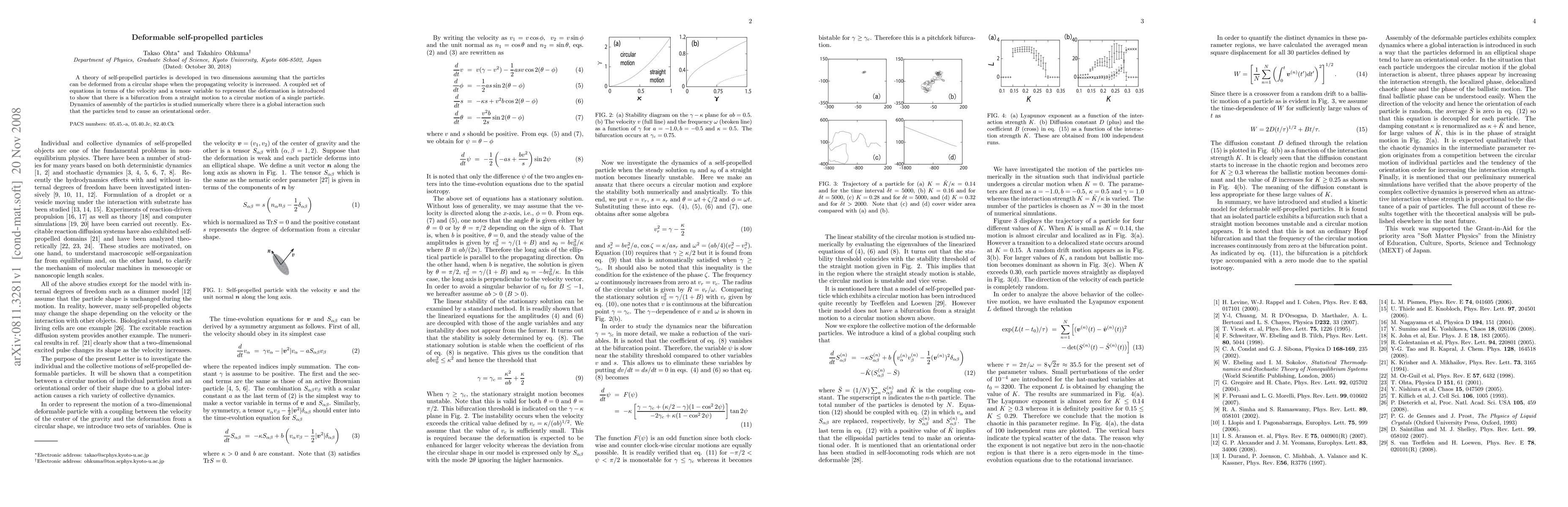 This paper develops a theory for deformable self-propelled particles in two dimensions, introducing equations to model their velocity and deformation. It demonstrates a bifurcation from linear to circular motion and shows numerical results of particle assembly leading to orientational order through global interactions.