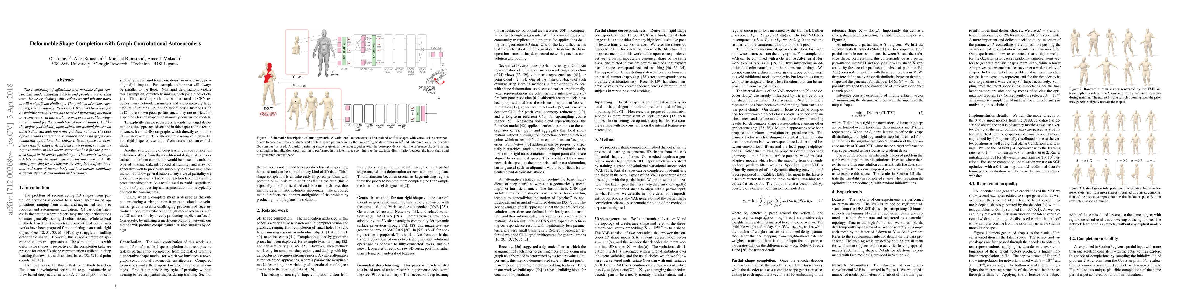 This paper proposes a novel learning-based method for completing partial 3D shapes, especially those undergoing non-rigid deformations, using a graph convolutional autoencoder. The method optimizes a latent space representation to reconstruct realistic unknown parts of scanned objects, demonstrating effective results on human body and face meshes.