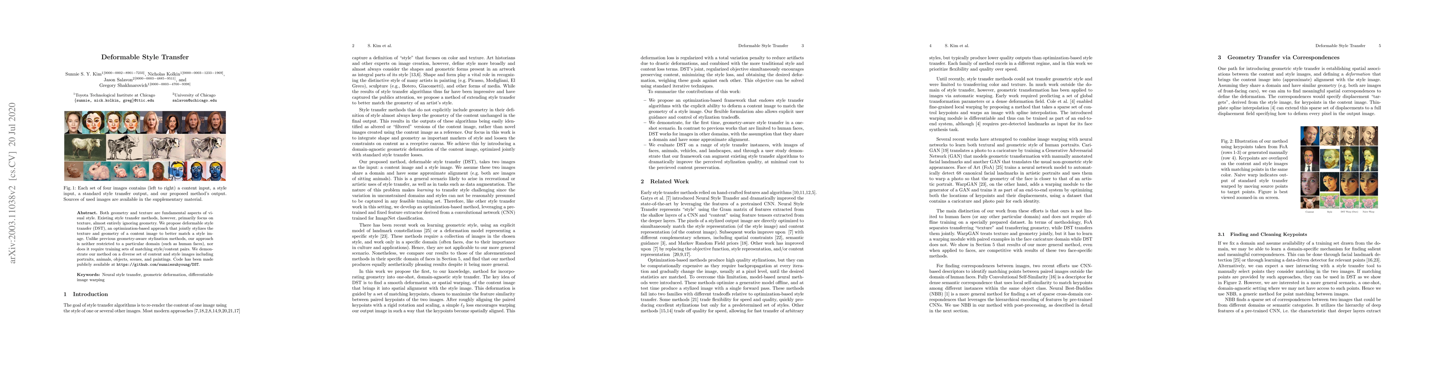 The paper introduces deformable style transfer (DST), an optimization-based method that stylizes both texture and geometry of a content image to match a style image, without domain-specific constraints or training data. The method is demonstrated across various content types and is publicly available for use.