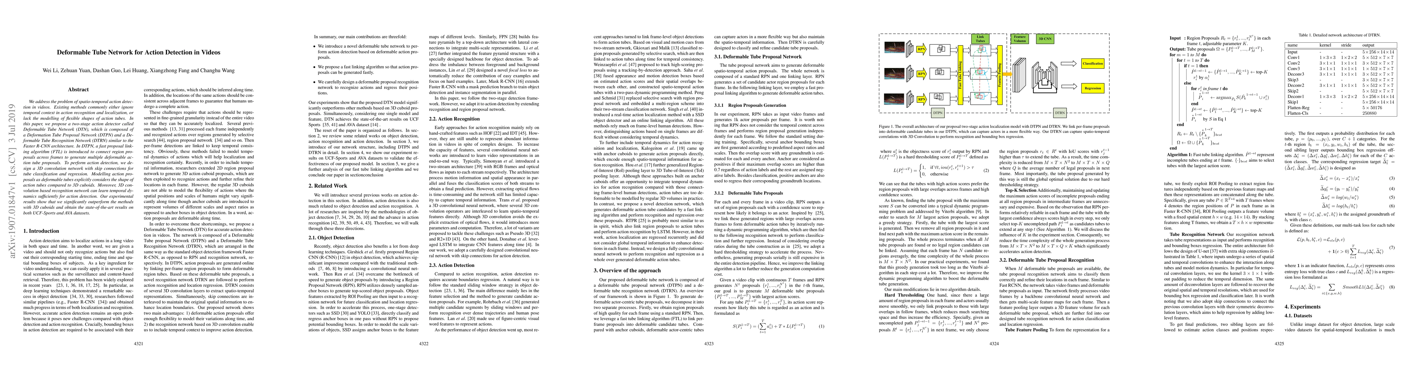 We address the problem of spatio-temporal action detection in videos. Existing methods commonly either ignore temporal context in action recognition and localization, or lack the modelling of flexible shapes of action tubes. In this paper, we propose a two-stage action detector called Deformable Tube Network (DTN), which is composed of a Deformation Tube Proposal Network (DTPN) and a Deformable Tube Recognition Network (DTRN) similar to the Faster R-CNN architecture. In DTPN, a fast proposal linking algorithm (FTL) is introduced to connect region proposals across frames to generate multiple deformable action tube proposals. To perform action detection, we design a 3D convolution network with skip connections for tube classification and regression. Modelling action proposals as deformable tubes explicitly considers the shape of action tubes compared to 3D cuboids. Moreover, 3D convolution based recognition network can learn temporal dynamics sufficiently for action detection. Our experimental results show that we significantly outperform the methods with 3D cuboids and obtain the state-of-the-art results on both UCF-Sports and AVA datasets.
