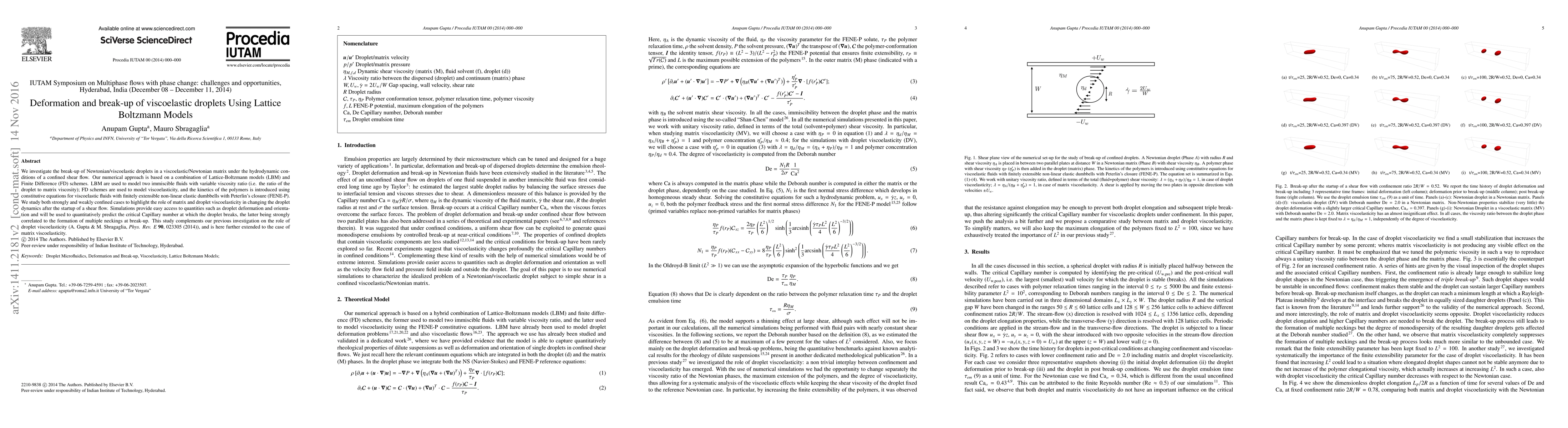 This paper investigates the deformation and break-up of Newtonian/viscoelastic droplets in a viscoelastic/Newtonian matrix under shear flow using a combination of Lattice-Boltzmann and Finite Difference methods. The study highlights the role of matrix and droplet viscoelasticity in altering droplet dynamics and predicts the critical Capillary number for droplet break-up.
