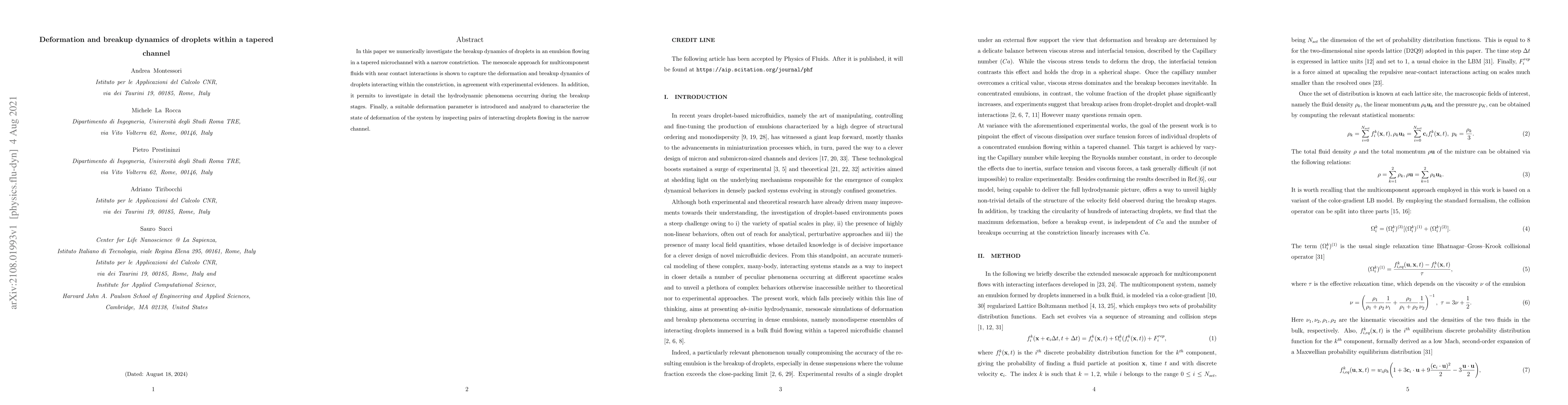 This paper numerically investigates the deformation and breakup dynamics of emulsion droplets in a tapered microchannel using a mesoscale approach, capturing detailed hydrodynamic phenomena and introducing a deformation parameter to characterize droplet interactions. The findings align with experimental observations.