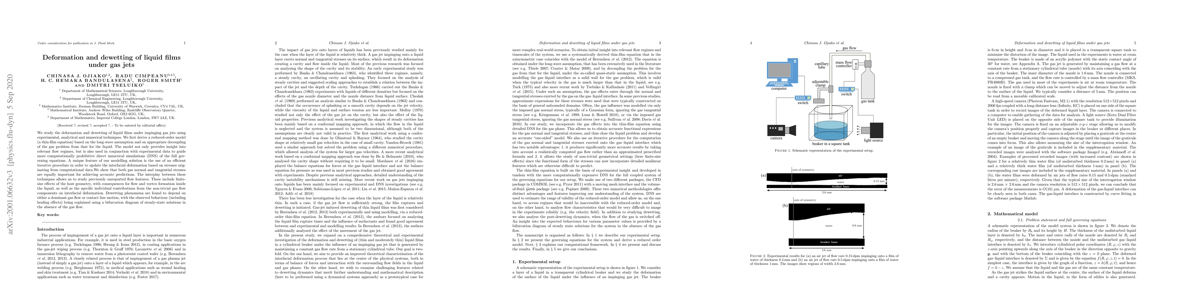 We study the deformation and dewetting of liquid films under impinging gas jets using experimental, analytical and numerical techniques. We first derive a reduced-order model (a thin-film equation) based on the long-wave assumption and on appropriate decoupling of the gas problem from that for the liquid. The model not only provides insight into relevant flow regimes, but is also used in conjunction with experimental data to guide more computationally prohibitive direct numerical simulations (DNS) of the full governing equations. A unique feature of our modelling solution is the use of an efficient iterative procedure in order to update the interfacial deformation based on stresses originating from computational data. We show that both gas normal and tangential stresses are equally important for achieving accurate predictions. The interplay between these techniques allows us to study previously unreported flow features. These include finite-size effects of the host geometry, with consequences for flow and vortex formation inside the liquid, as well as the specific individual contributions from the non-trivial gas flow components on interfacial deformation. Dewetting phenomena are found to depend on either a dominant gas flow or contact line motion, with the observed behaviour (including healing effects) being explained using a bifurcation diagram of steady-state solutions in the absence of the gas flow.
