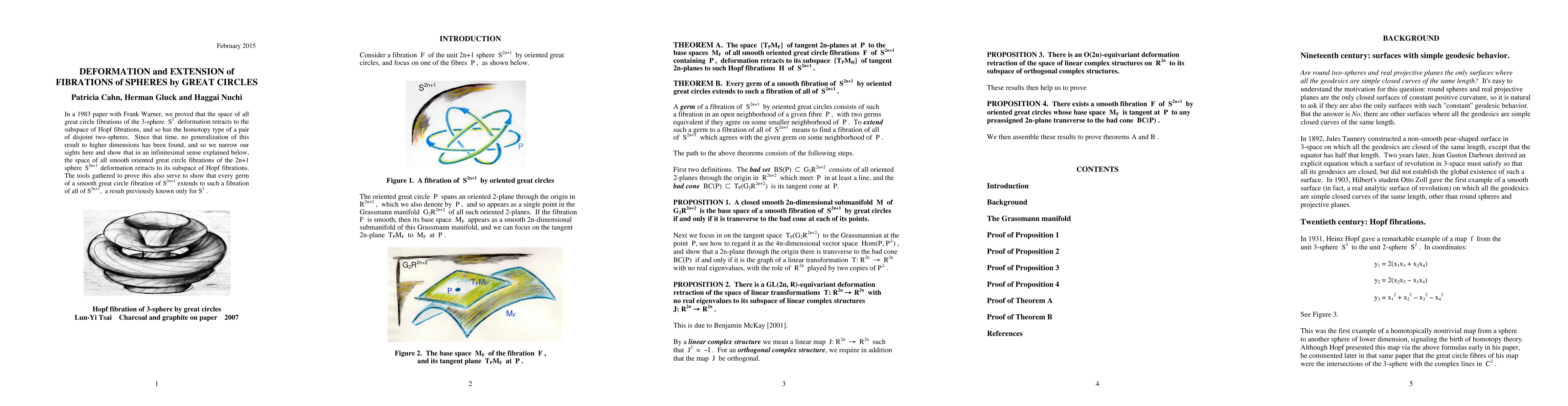 In a 1983 paper with Frank Warner, we proved that the space of all great circle fibrations of the 3-sphere S^3 deformation retracts to the subspace of Hopf fibrations, and so has the homotopy type of a pair of disjoint two-spheres. Since that time, no generalization of this result to higher dimensions has been found, and so we narrow our sights here and show that in an infinitesimal sense explained below, the space of all smooth oriented great circle fibrations of the 2n+1 sphere S^(2n+1) deformation retracts to its subspace of Hopf fibrations. The tools gathered to prove this also serve to show that every germ of a smooth great circle fibration of S^(2n+1) extends to such a fibration of all of S^(2n+1), a result previously known only for S^3 .
