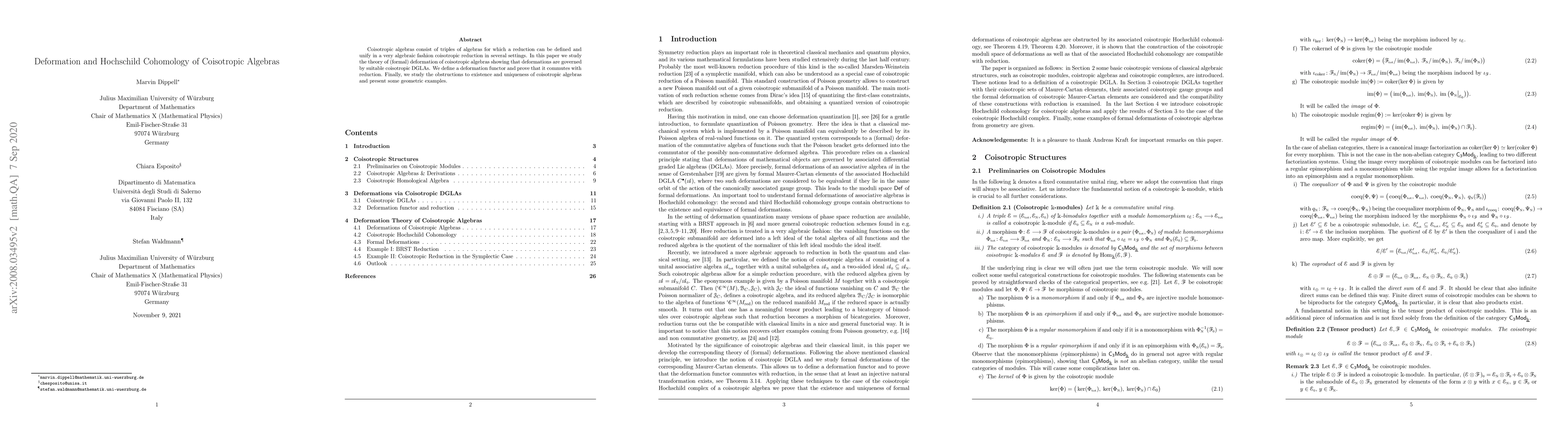 This paper explores the deformation theory of coisotropic algebras, demonstrating that their deformations are governed by specific coisotropic differential graded Lie algebras (DGLAs). It defines a deformation functor and shows its compatibility with reduction, while also investigating the obstructions to the existence and uniqueness of these algebras with geometric examples.
