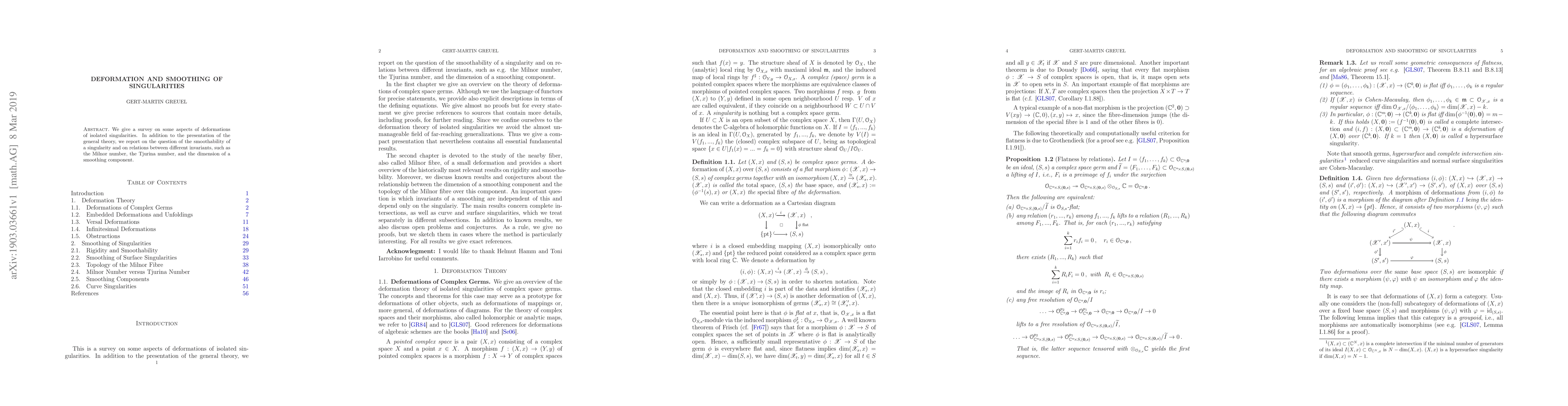 This paper surveys key aspects of deformations of isolated singularities, including smoothability and relations between invariants such as Milnor number and Tjurina number.