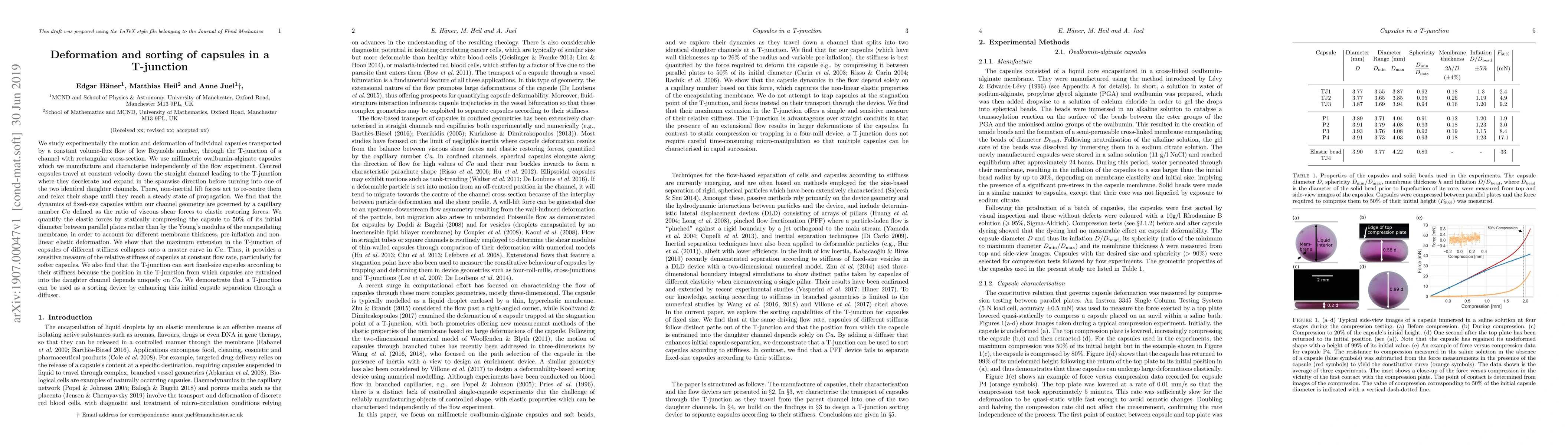 The study experimentally investigates the motion and deformation of individual capsules transported by a constant volume-flux flow of low Reynolds number through a T-junction of a rectangular cross-section channel. Millimetric ovalbumin-alginate capsules are manufactured and characterized independently of the flow experiment, with their dynamics governed by a capillary number (Ca) defined as the ratio of viscous shear forces to elastic restoring forces.