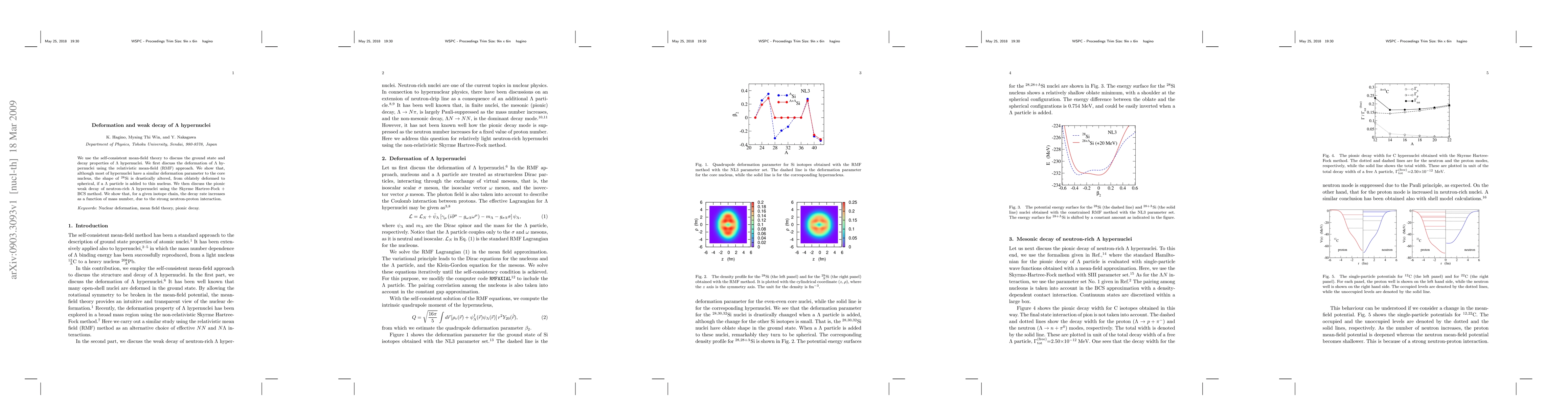 This paper investigates the deformation and decay properties of $\Lambda$ hypernuclei using self-consistent mean-field theory. It finds that the addition of a $\Lambda$ particle to $^{28}$Si drastically changes its shape from oblate to spherical. Additionally, the study reveals that the pionic weak decay rate of neutron-rich $\Lambda$ hypernuclei increases with mass number, driven by the strong neutron-proton interaction.