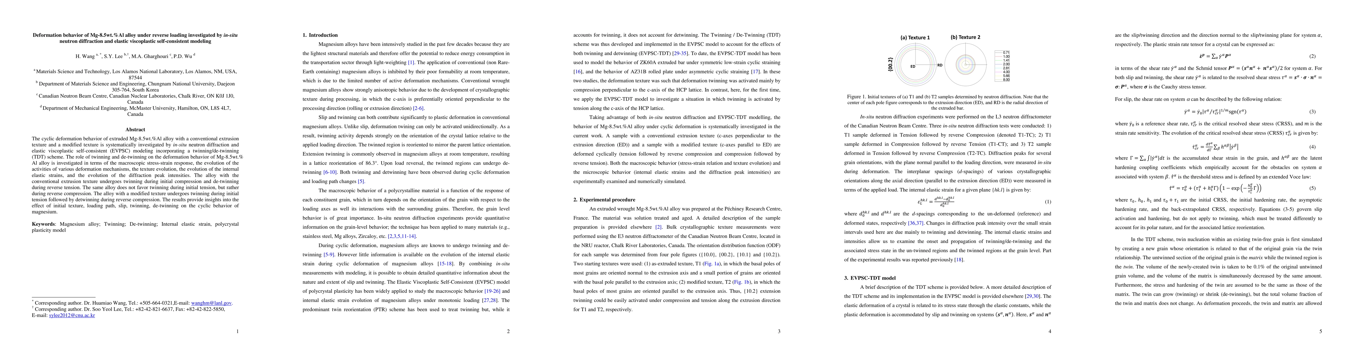 This research uses neutron diffraction and EVPSC modeling to study the cyclic deformation of Mg-8.5wt.%Al alloy. It reveals that twinning and de-twinning significantly impact the alloy's behavior, influenced by initial texture and loading path, providing insights into magnesium alloy cyclic performance.