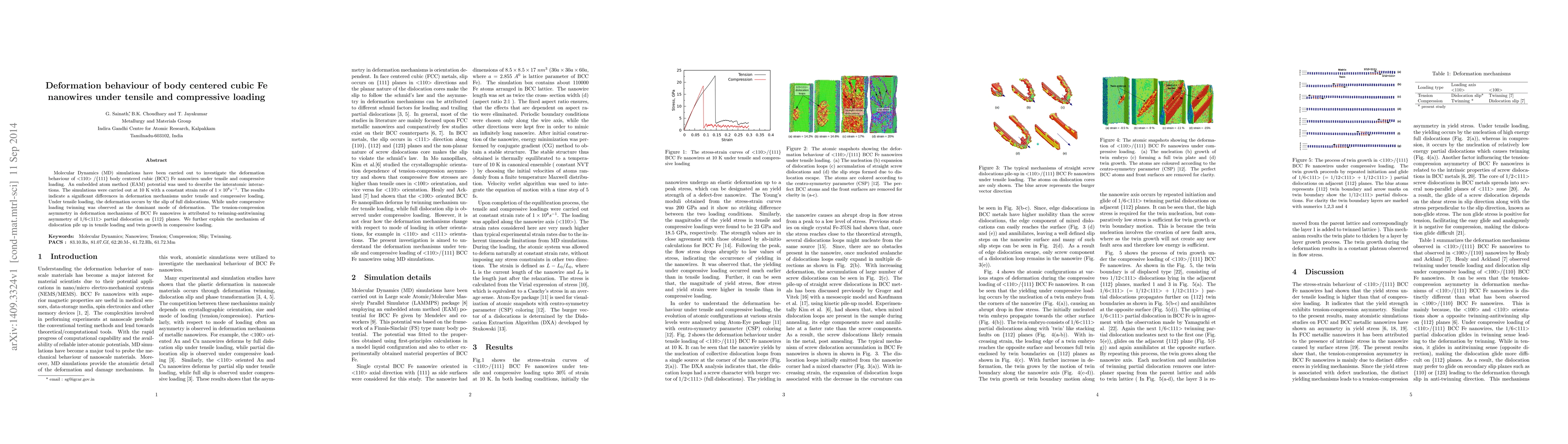 Molecular Dynamics simulations reveal distinct deformation mechanisms in BCC Fe nanowires under tensile and compressive loading, with slip of full dislocations under tension and twinning under compression, attributed to the 1/6<111> partial dislocation twinning-antitwinning asymmetry.
