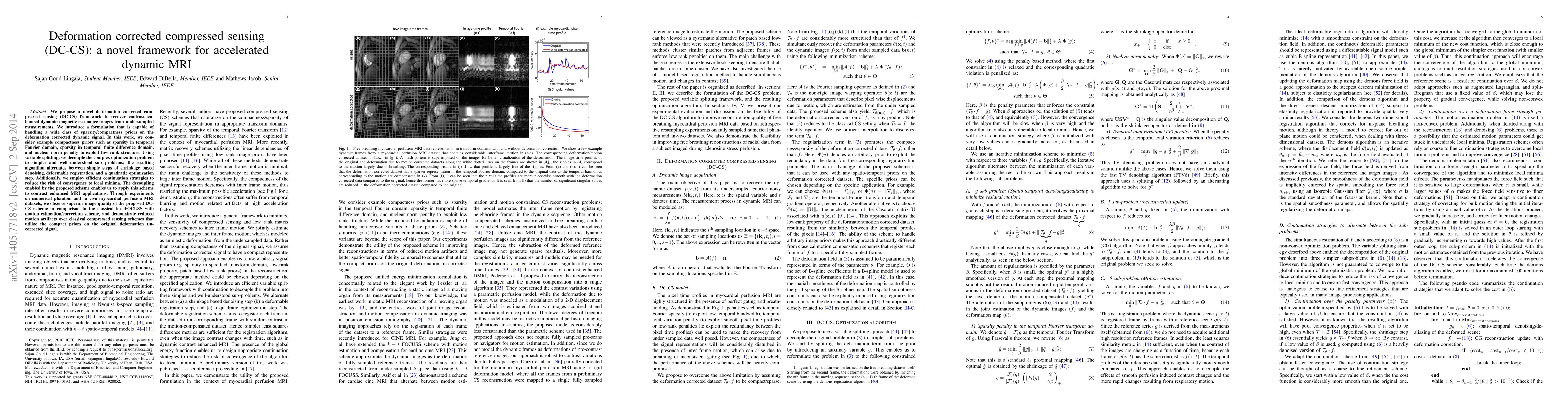 The paper introduces a novel deformation corrected compressed sensing (DC-CS) framework for accelerated dynamic MRI, employing generalized sparsity priors for improved reconstruction. The proposed method efficiently decouples optimization into simpler steps, enabling robust reconstructions with reduced motion artifacts compared to traditional compressed sensing.