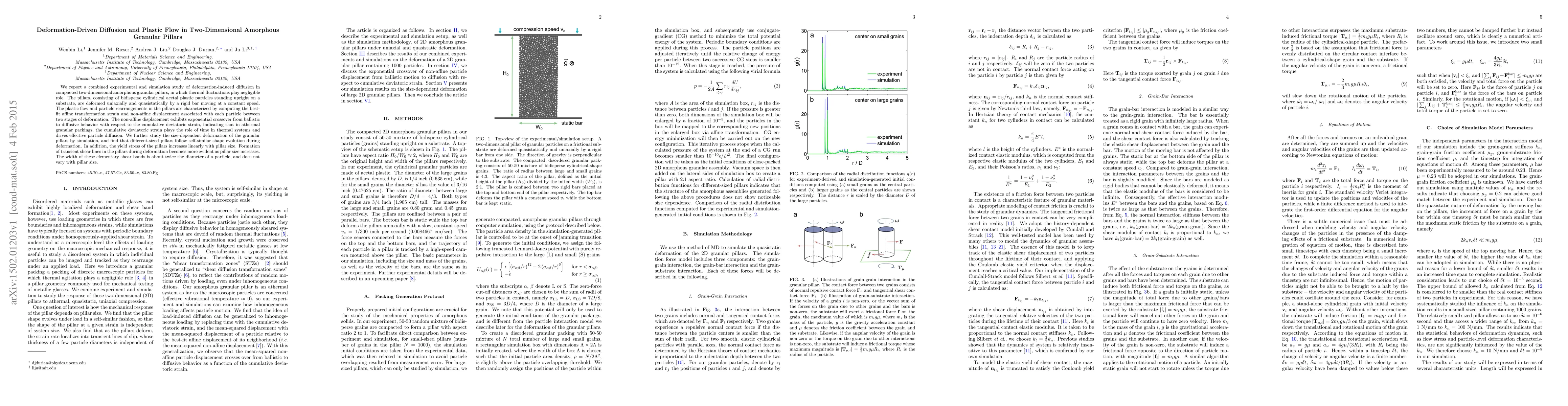 This study investigates deformation-induced diffusion in two-dimensional amorphous granular pillars composed of bidisperse acetal particles, showing that plastic flow and particle rearrangements follow non-affine displacements. The research reveals that the cumulative deviatoric strain drives effective particle diffusion akin to time in thermal systems.