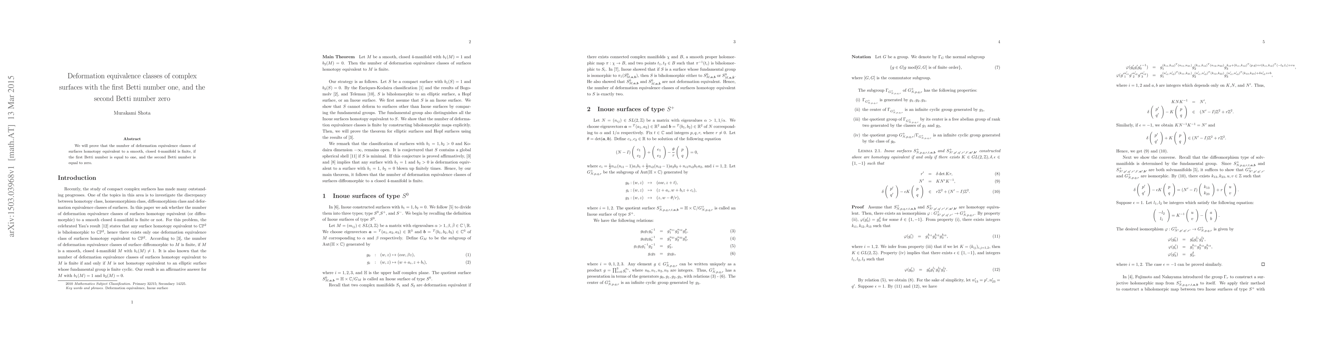 This paper demonstrates that surfaces with a first Betti number of one and a second Betti number of zero have a finite number of deformation equivalence classes, proving the finiteness under specified topological conditions.