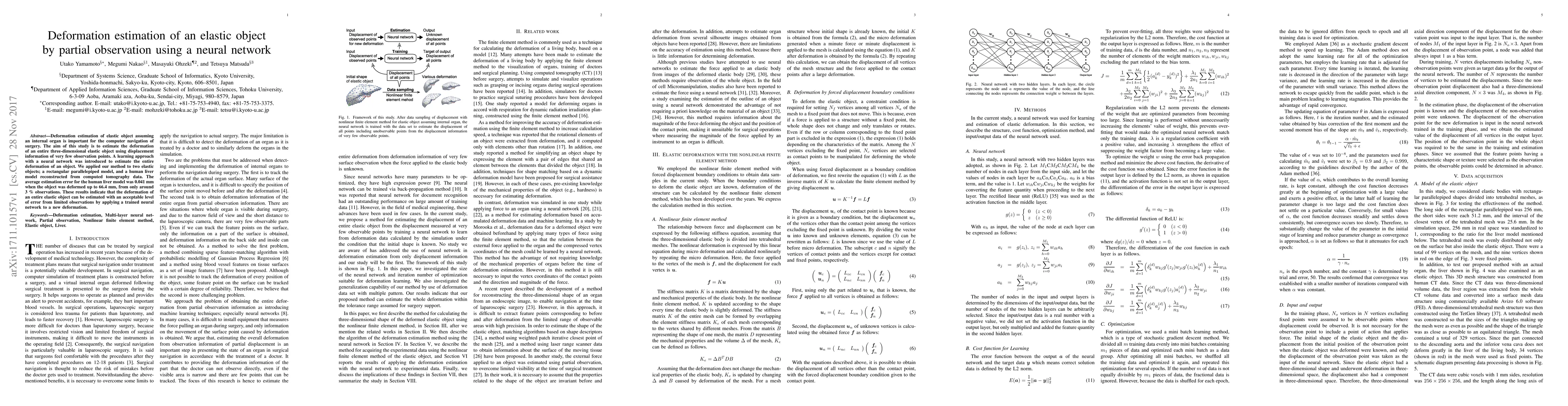 Deformation estimation of elastic object assuming an internal organ is important for the computer navigation of surgery. The aim of this study is to estimate the deformation of an entire three-dimensional elastic object using displacement information of very few observation points. A learning approach with a neural network was introduced to estimate the entire deformation of an object. We applied our method to two elastic objects; a rectangular parallelepiped model, and a human liver model reconstructed from computed tomography data. The average estimation error for the human liver model was 0.041 mm when the object was deformed up to 66.4 mm, from only around 3 % observations. These results indicate that the deformation of an entire elastic object can be estimated with an acceptable level of error from limited observations by applying a trained neural network to a new deformation.