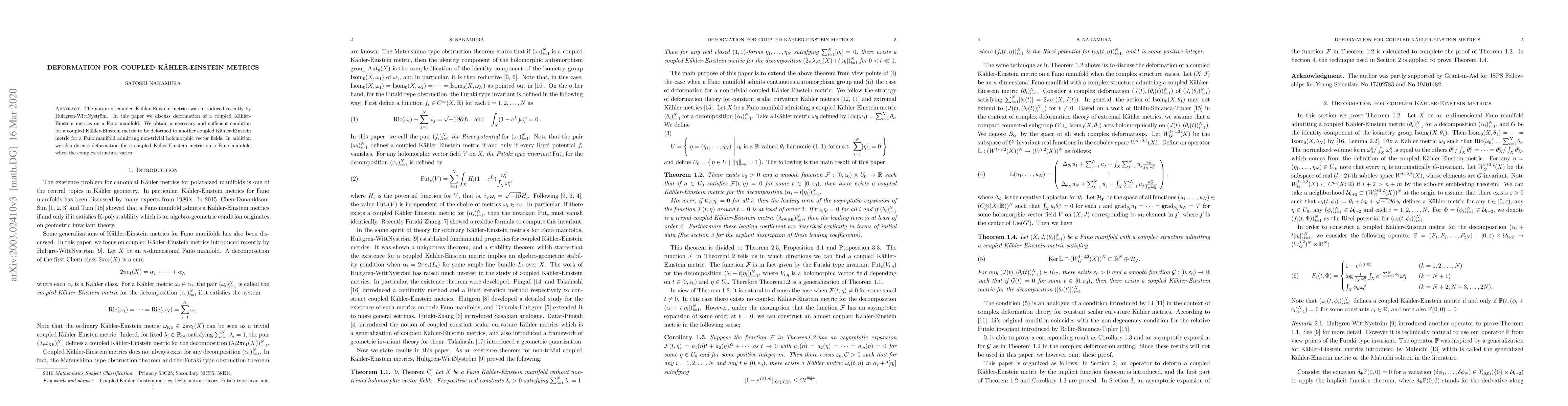 This paper explores the deformation of coupled Kähler-Einstein metrics on Fano manifolds, providing a necessary and sufficient condition for such deformations when non-trivial holomorphic vector fields are present. It also investigates deformation scenarios where the complex structure varies.